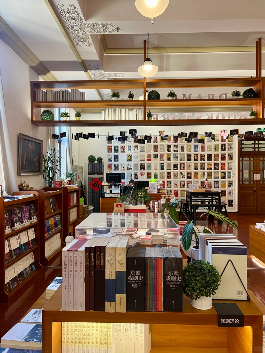 此外,这里还有一家以戏剧为主题的书店。店内有一墙面展示北京人艺建院以来的近200部剧目海报及老戏单,店内书籍也是戏剧相关,其中人艺出品发行的图书和作者签名本都是店内一大特色。