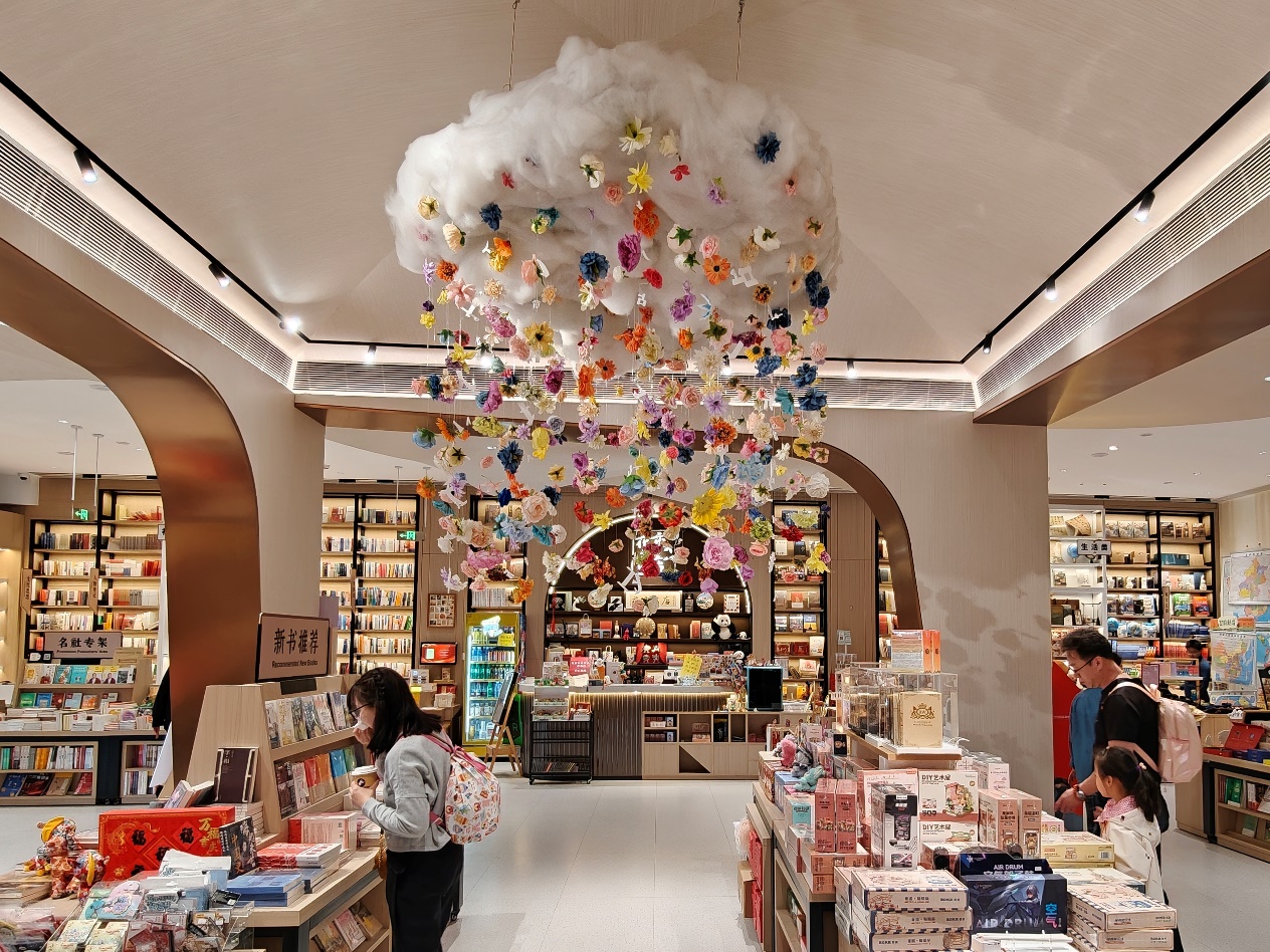 花市书店作为东城区的文化名片,历经岁月沉淀,早已成为周边居民心中的精神栖息地。踏入店门,暖米色的空间里,弧形拱门串联起错落的书架,巨型“花云”悬于中庭,千朵彩花从云间垂落,将老北京绢花的非遗浪漫揉进书香里,连呼吸都染上了纸页与鲜花的温软气息。