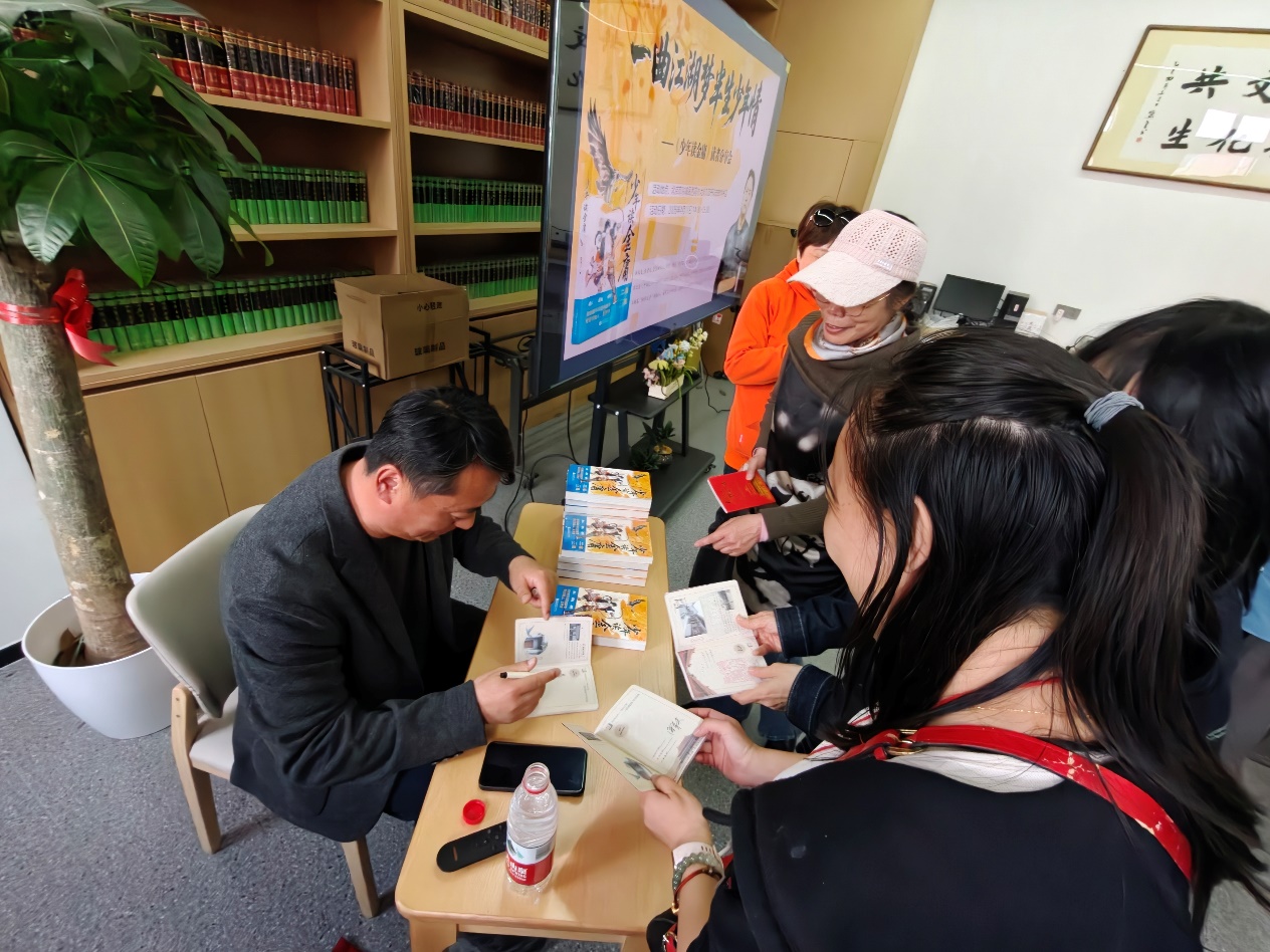 分享会尾声,潘老师为现场读者签名赠书,读者们捧着签好名的《少年读金庸》,与潘老师合影留念,脸上满是收获的喜悦。