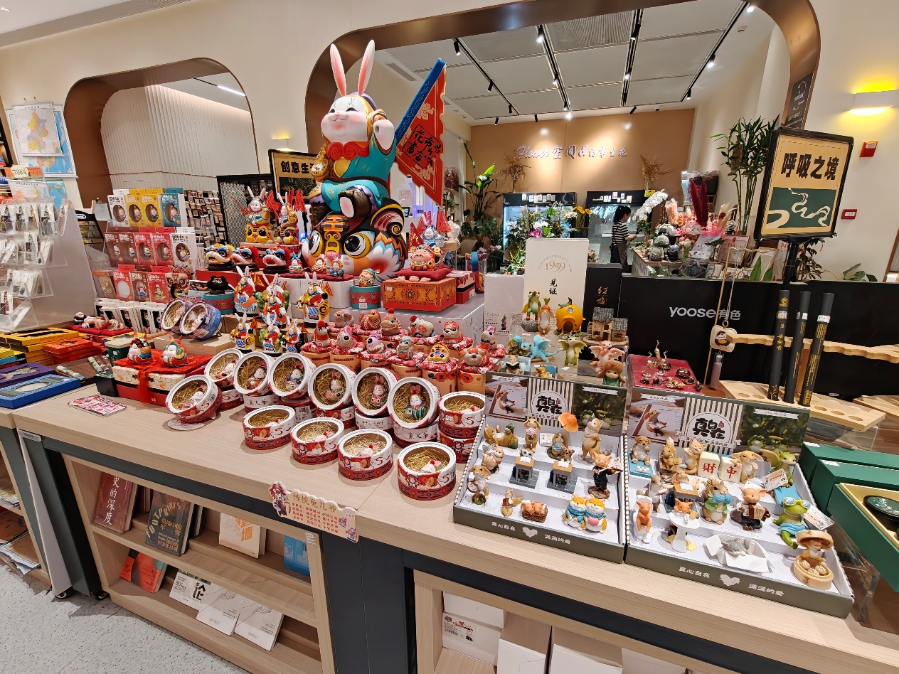 文史类书架前,“读书提升脑值”的标语温柔醒神,读者们指尖轻轻划过书脊,目光在熟悉的经典与新鲜的佳作间流连,心里满是寻觅知音的雀跃;有人俯身在展台前翻着心仪的书,嘴角不自觉扬起笑意,仿佛已经在字里行间寻到了片刻的安宁。文创区里,巨型兔爷坐镇,萌趣摆件与京味好物相映,逛累的读者坐在书架旁的沙发上歇息,手中捧着刚选好的书静静品读,所有的浮躁都被墨香抚平。
