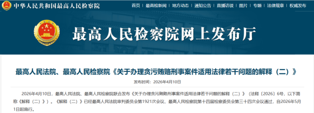 4月10日,最高人民法院、最高人民检察院联合发布《关于办理贪污贿赂刑事案件适用法律若干问题的解释(二)》,对单位行贿罪、单位受贿罪等罪名的定罪量刑标准作出细化,于5月1日起执行。