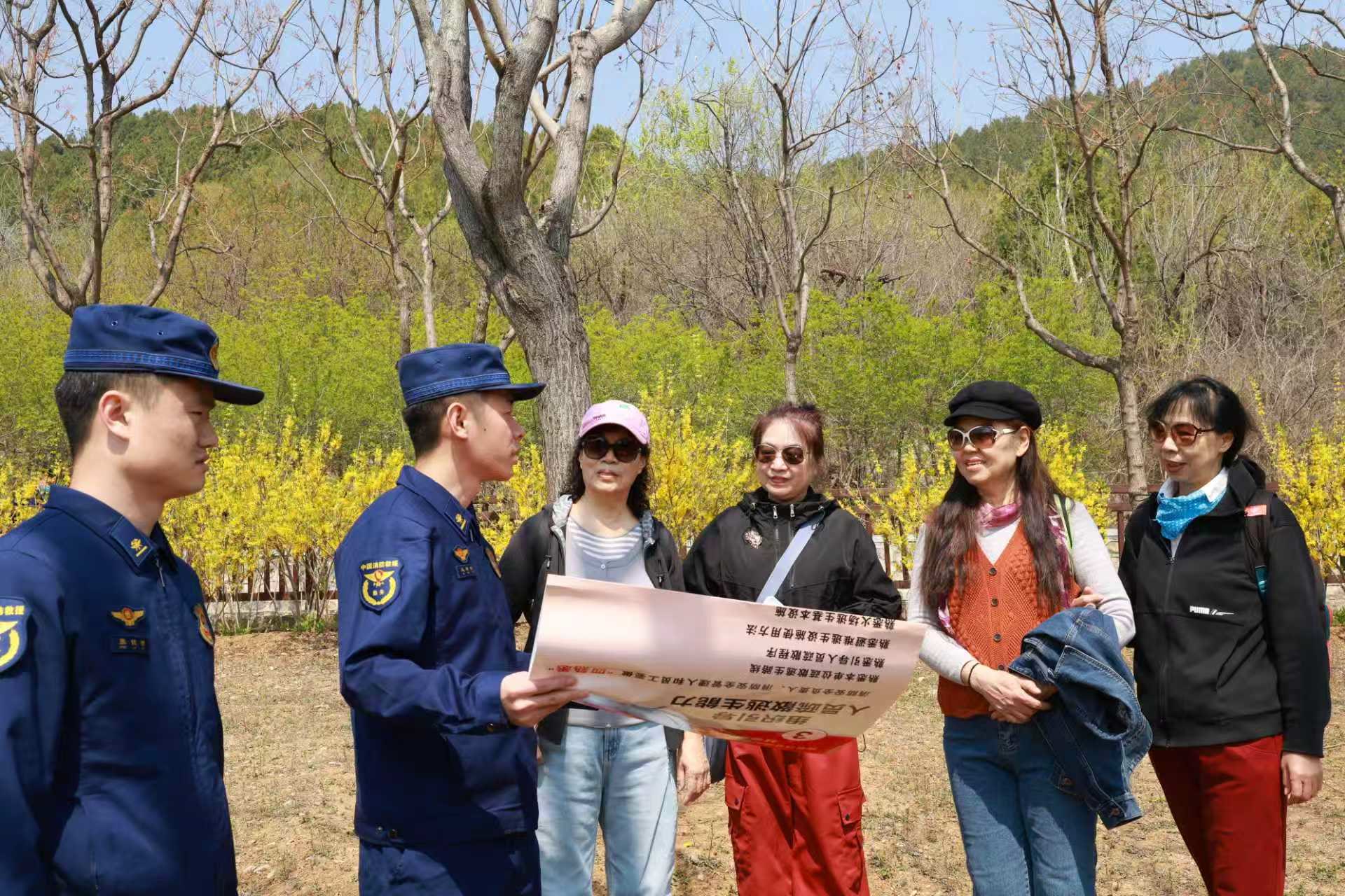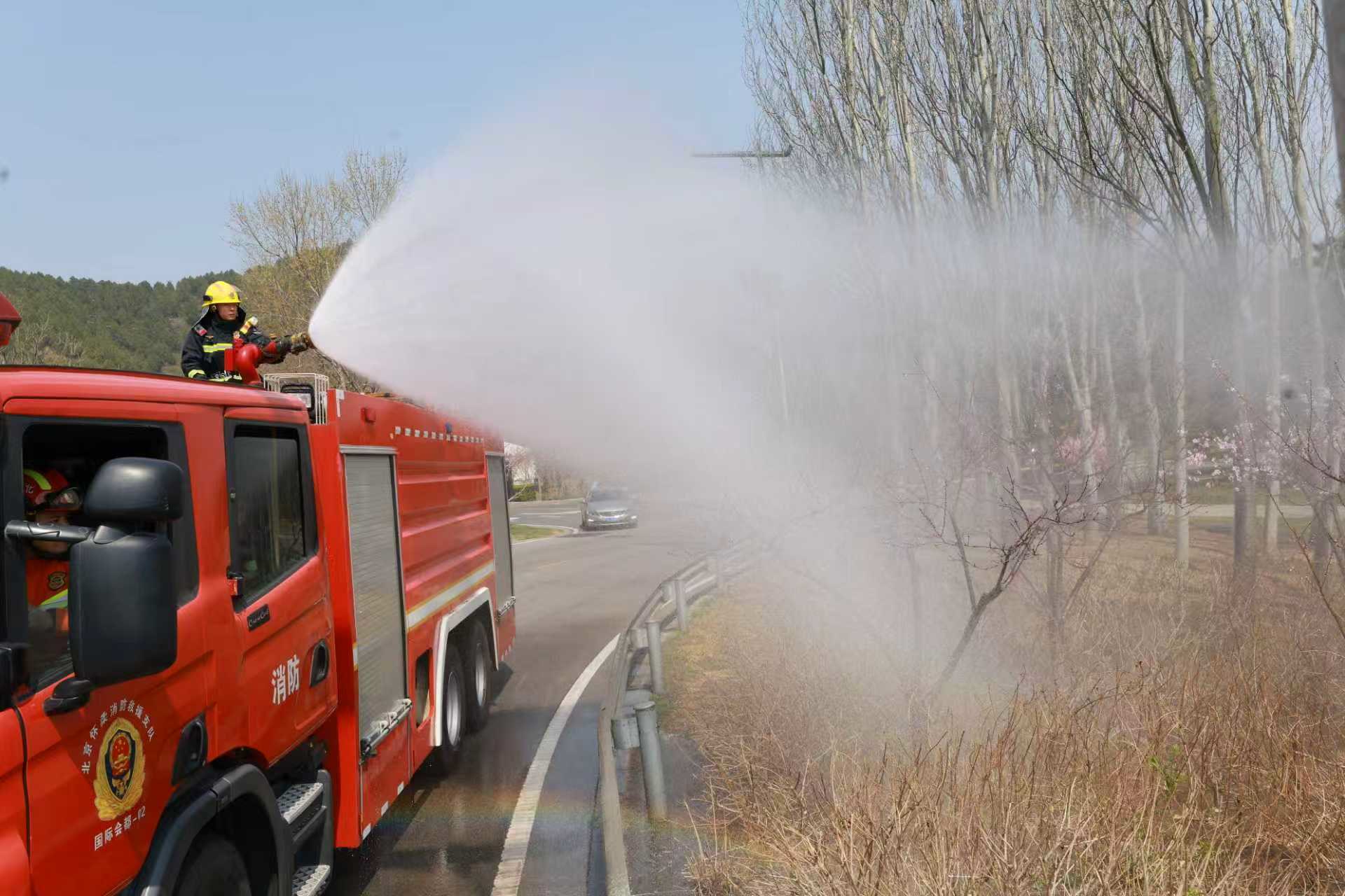 演练之后,消防站的队员兵分两路,一队来到雁栖湖景区,向赏花的市民游客宣传日常生活中科学自救、避险的常识,另一队驾驶消防车,沿辖区主要道路对荒草、落叶较多的区域洒水增湿,降低火灾风险。