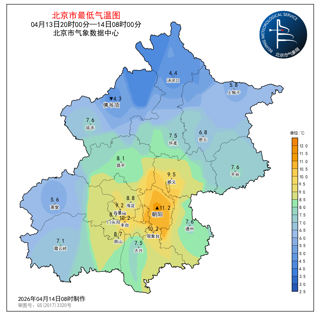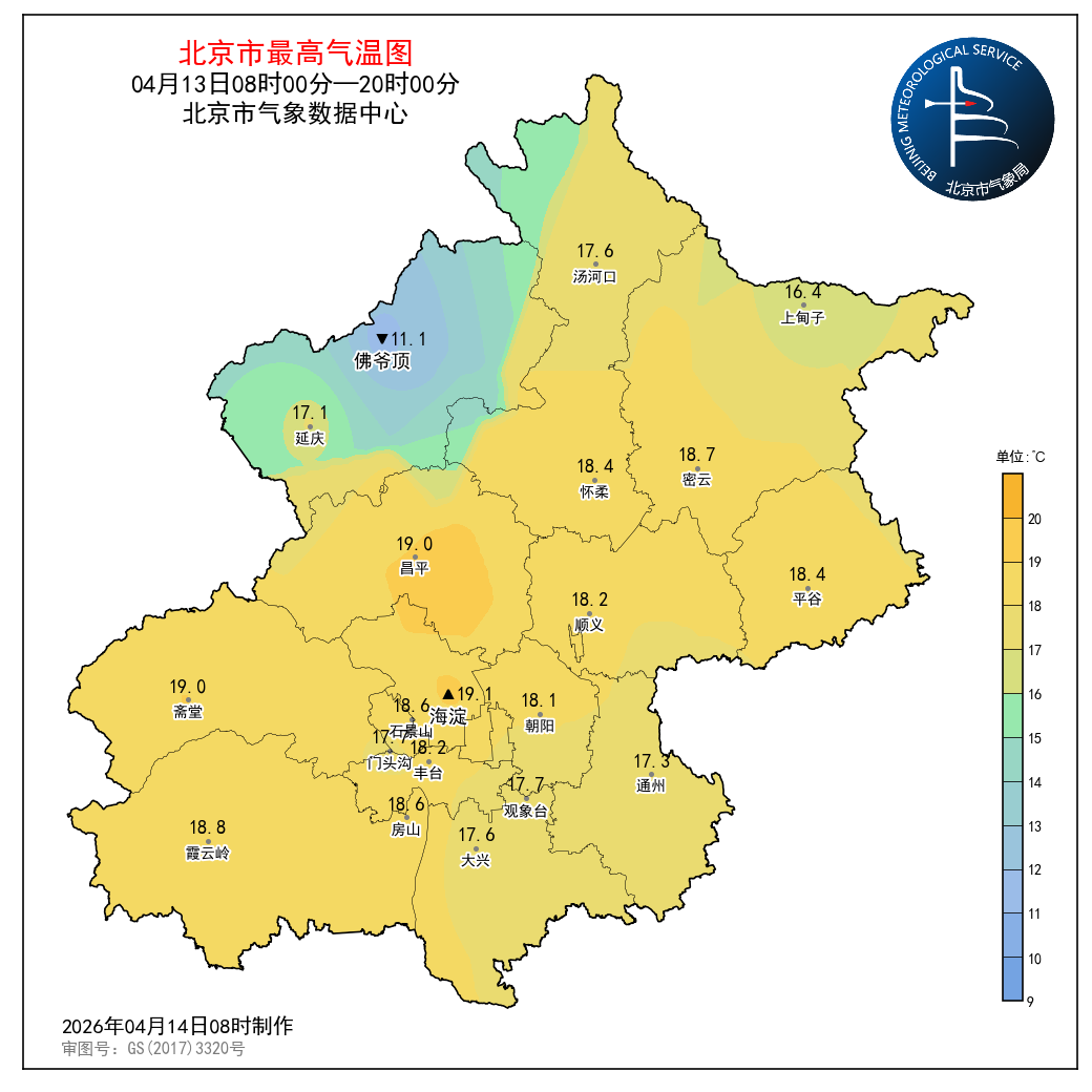 4月13日08时至4月14日08时,观象台最高气温17.7℃(16:23),最低气温10.2℃(03:17)。