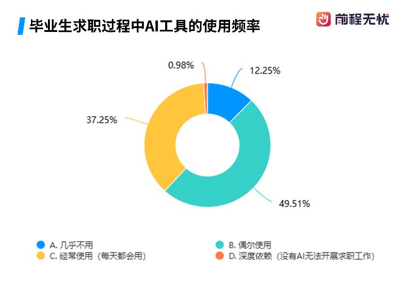 从使用频率来看,超过86%的受访毕业生在春招过程中使用过生成式AI工具,其中37.25%表示“每天都会使用”,另有近半数属于“偶尔使用”,仅有12.25%的毕业生几乎不使用AI。