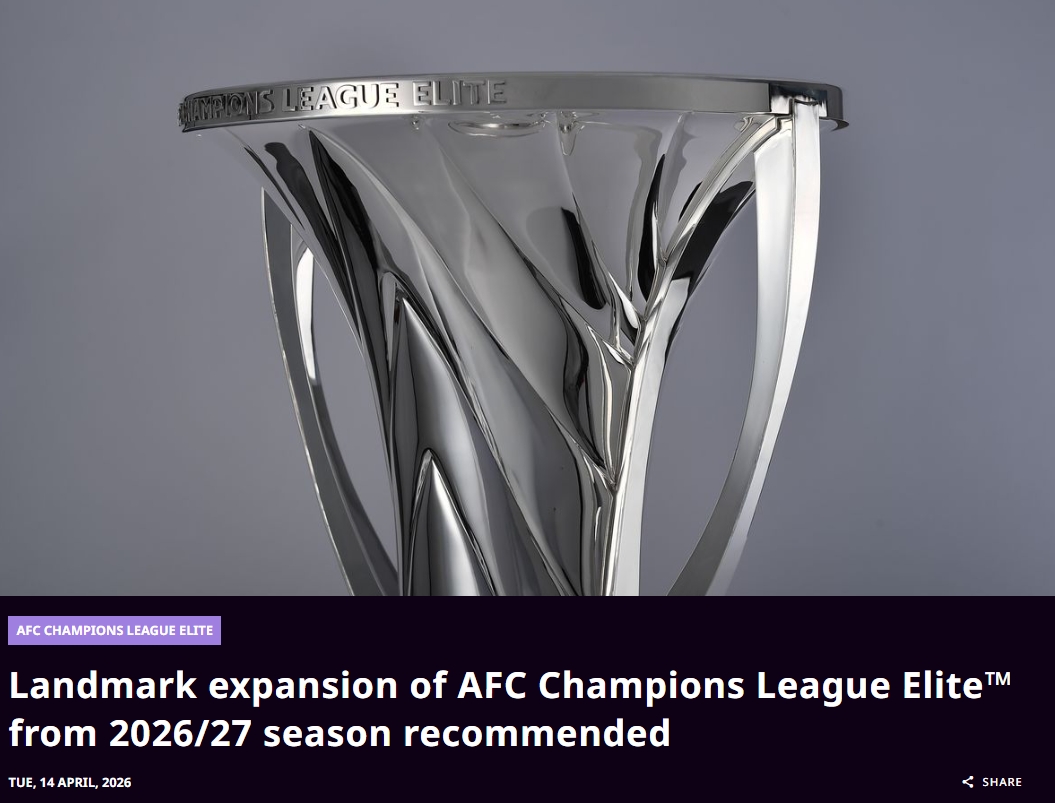 4月14日,亚足联官方发布公告,从2026/27赛季开始,亚冠精英联赛拟扩军至32队,相关决议经亚足联执行委员会批准后将生效。