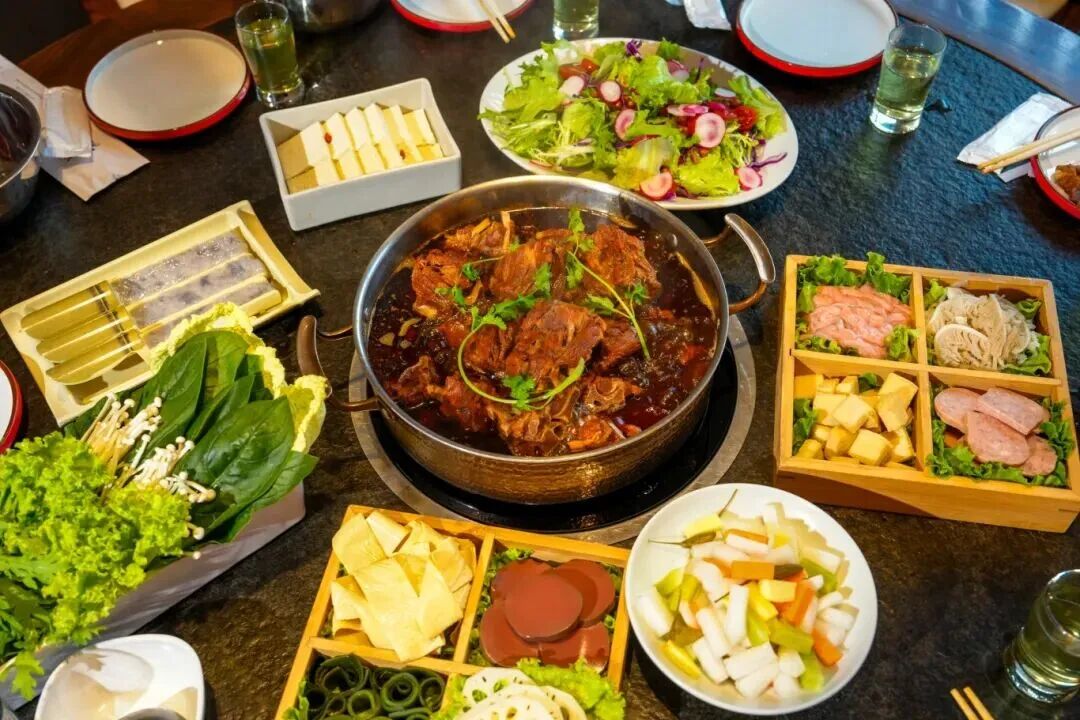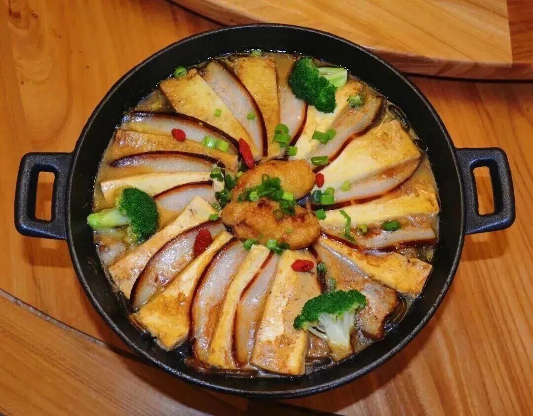 传统火盆上放上砂锅,加以白菜、豆腐、五花熏肉等食材,配上美容养颜的黄豆豆腐、滋补养肾的黑豆豆腐、清热袪火的绿豆豆腐。以素为主,荤素搭配、油而不腻,砂锅始终热乎吃起来味道淳厚,香味怡人。