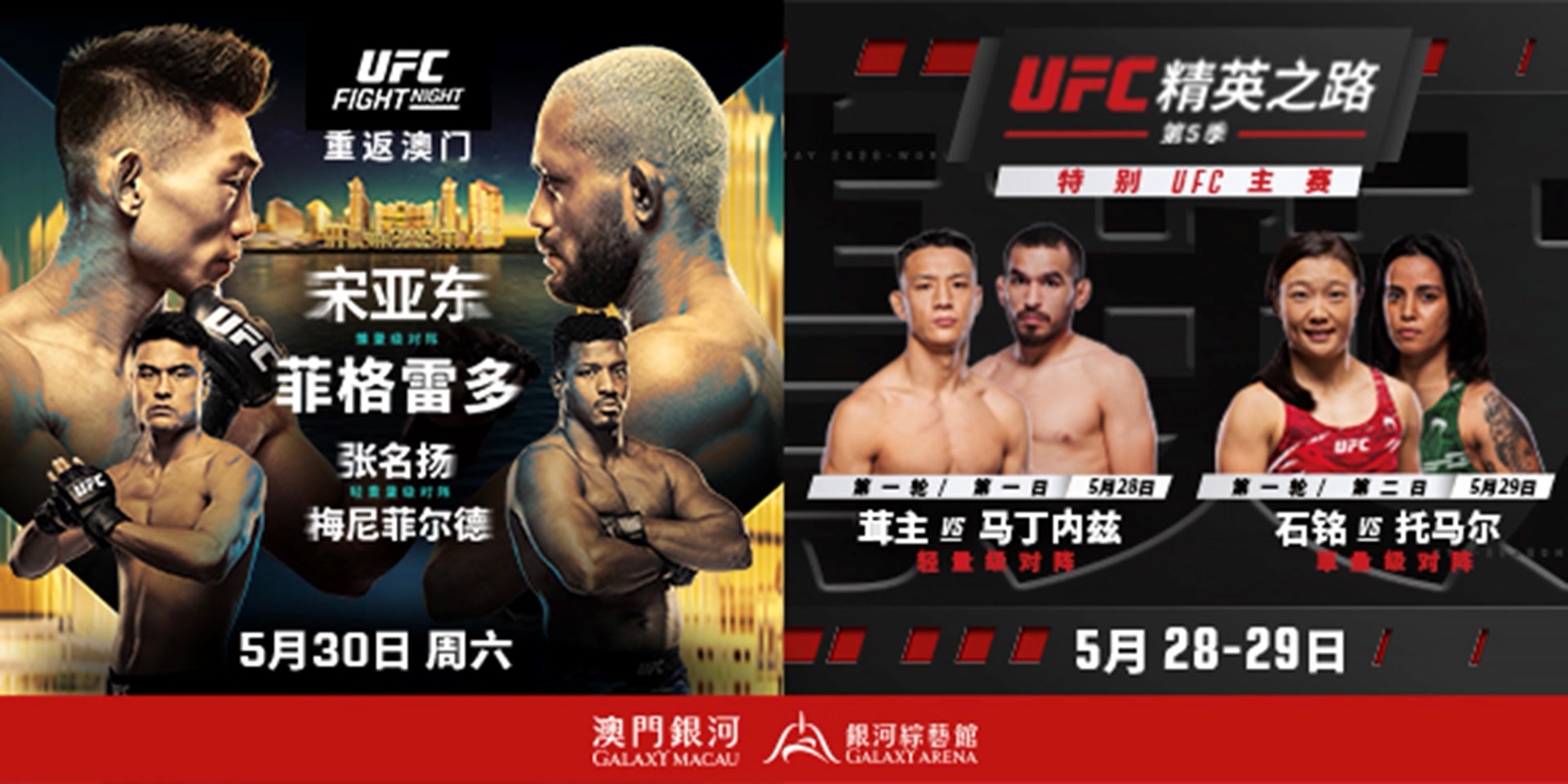 全球顶级综合格斗组织UFC即将重返澳门银河综艺馆,于5月30日举行UFC格斗之夜。而在28日和29日,UFC精英之路也将率先进行两场角逐。三晚精彩比赛将汇集多位中国名将。