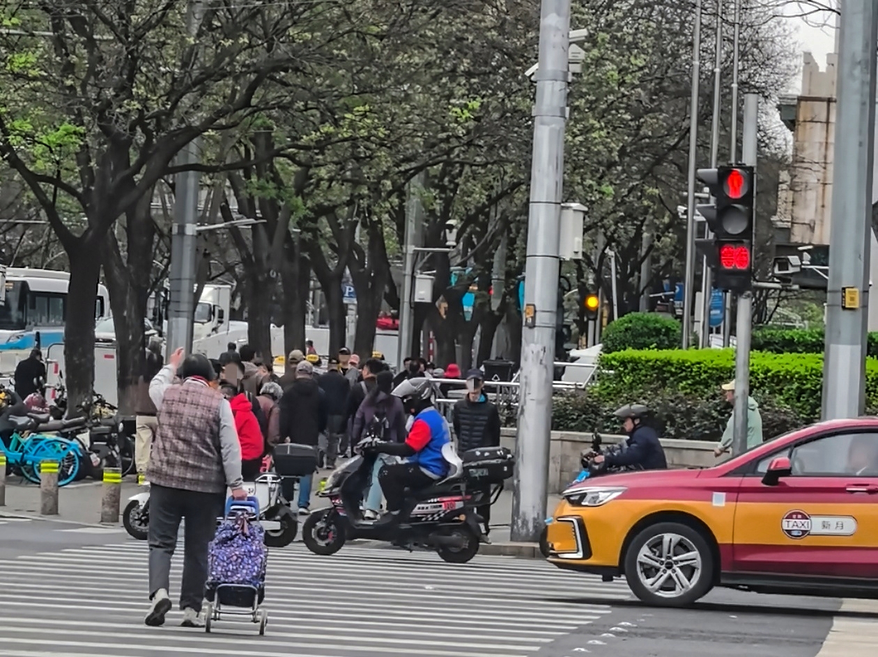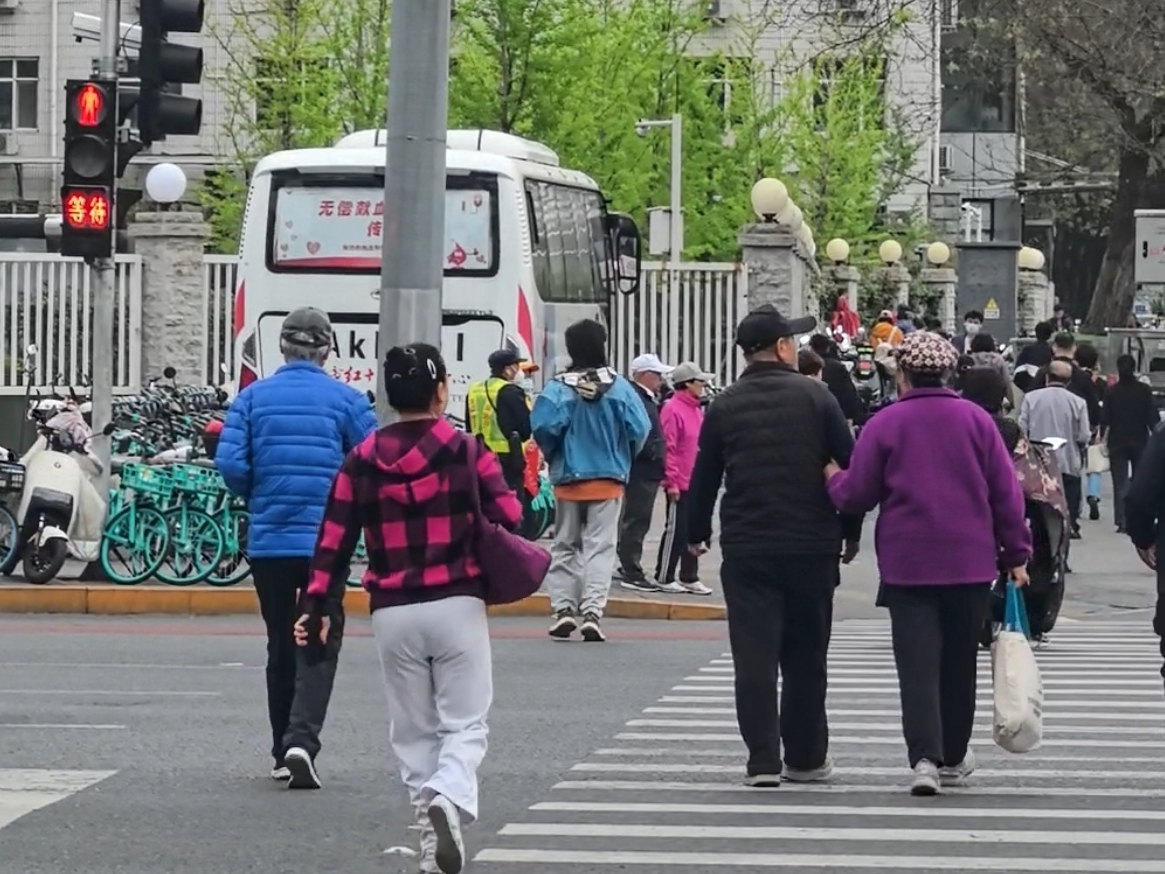 4月13日上午8点多,记者再次来到现场。周一早高峰的通勤与医患人流交织,过街人群格外拥挤。此时,行人绿灯时长延长至54秒,但由于人流量大,仍然会有行人没能在绿灯期间顺利通过。为确保一次性过街,不少从南向北的行人趁东西向直行车辆红灯时,抢先走上主路。但此时左转车辆绿灯,行人只能在车流前停下。