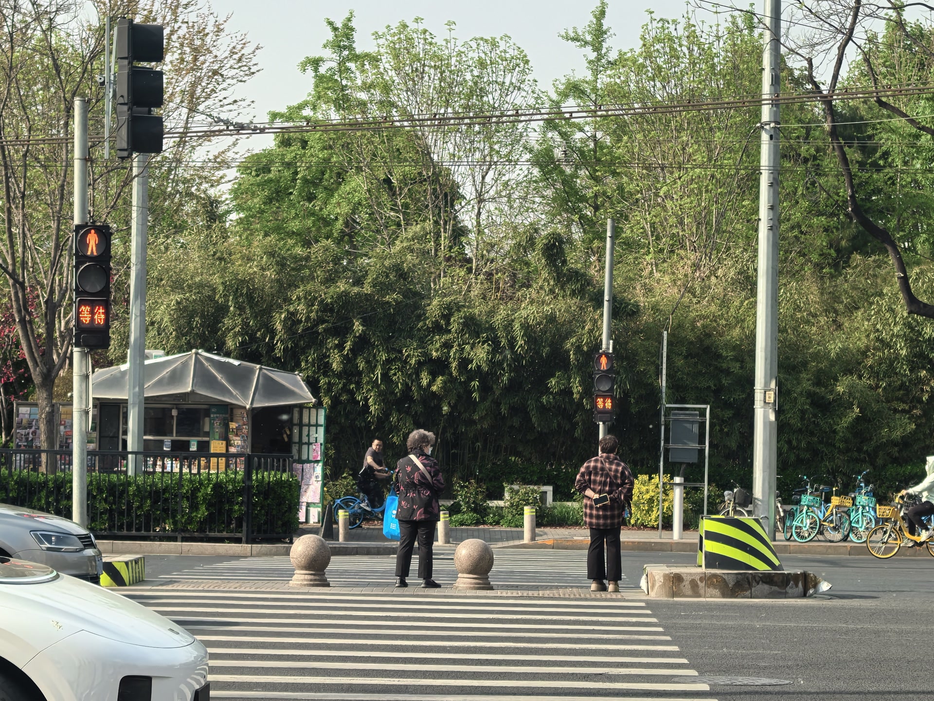9点半以后,通勤人流陆续减少,就医患者还有很多,其中不乏推轮椅、拄拐棍的老人,而行人绿灯重新缩短至44秒,过街难度再次升级。“人是少了点儿,可路还是这么宽,过着太费劲。”75岁的孙女士刚从宣武医院取完药,拉着购物小车走到路中间,绿灯就变成了红灯。眼看右边的车要开过来,她只好不停抬手示意,踉踉跄跄地从车流中穿行。等到了路边,她双手拽着灯杆,总算在人行道上站稳缓了口气。“我经常要来医院取药,每次过这个马路都害怕。灯变得太快了,我越着急,这腿越使不上力。”孙女士对刚才的惊险一幕仍心有余悸,“好不容易快走到边上,结果突然窜出来个车,吓得我腿都直打颤。路中间要是能有个歇脚的地儿,好歹也能安全点儿。”