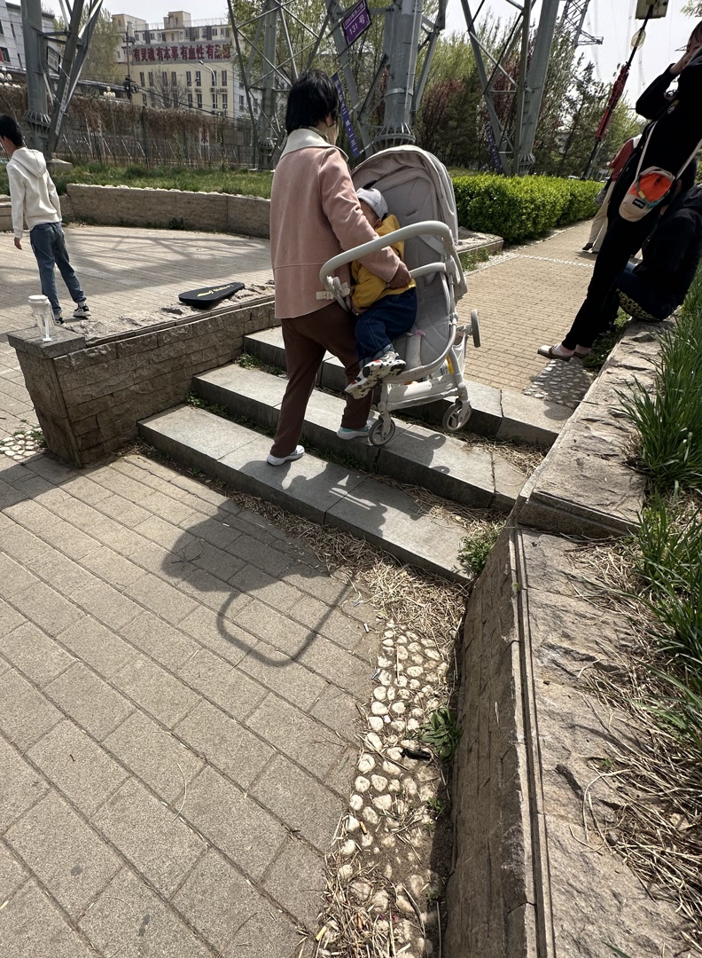 此外,园内的不少关键路段仅有台阶,未设置无障碍坡道,直接阻断了轮椅、婴儿车的通行。在北区中间,有一条在园内南北通行的必经之路,但这条路上的三级台阶却让推着轮椅和婴儿车的居民犯难。一位居民独自推婴儿车出行,行经此处时只能费力地把婴儿车抬起来,一步一步往上走,坐在车里的孩子被颠得身子歪向一侧。