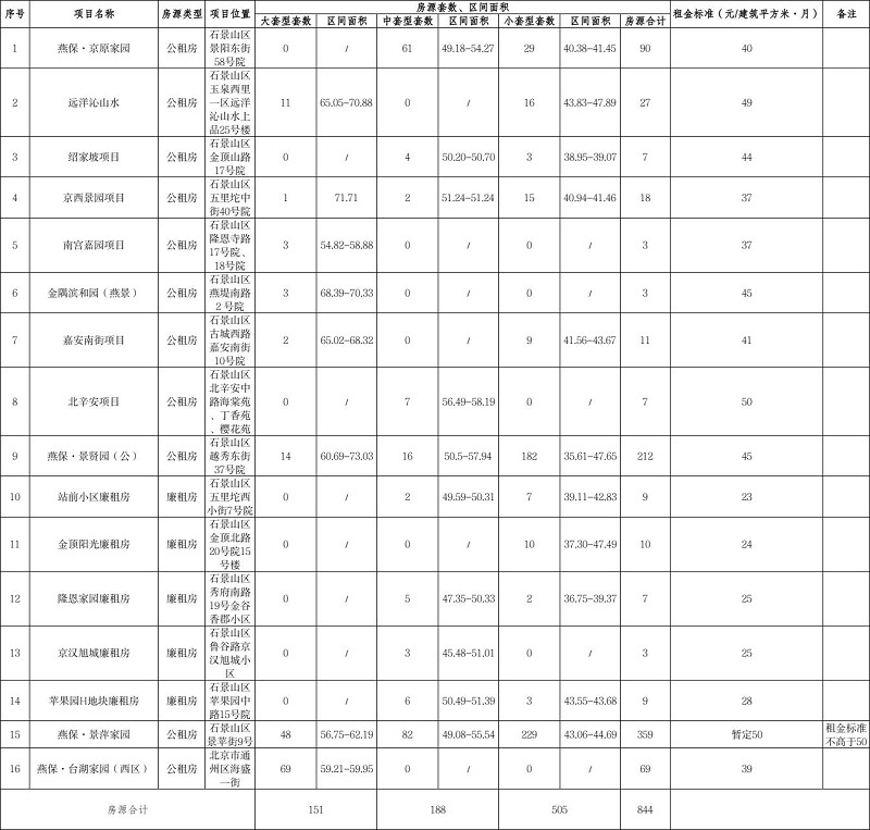 此次配租房源涉及11个公租房项目和5个廉租房项目,房源共计844套。项目详细情况见下表: