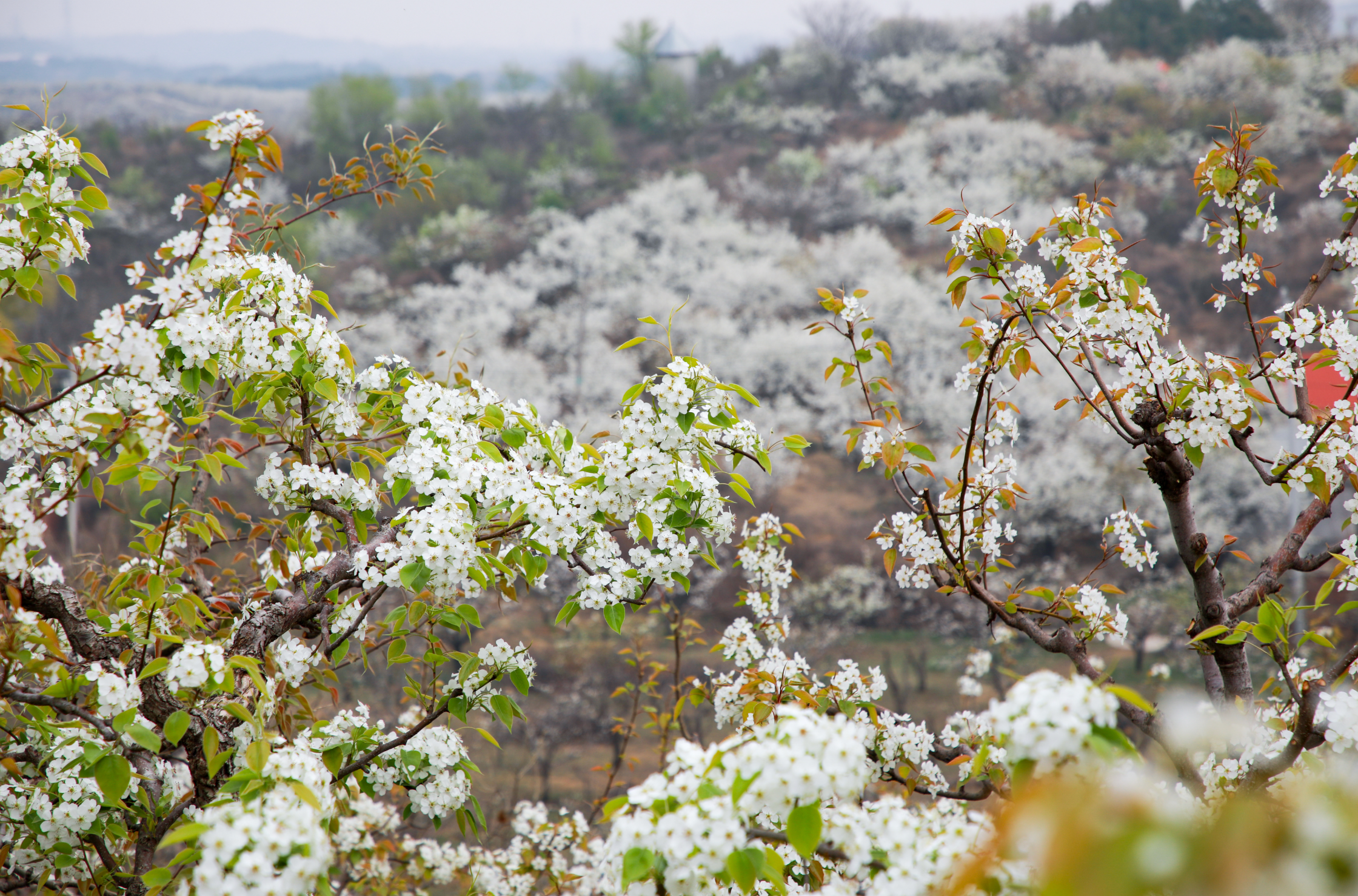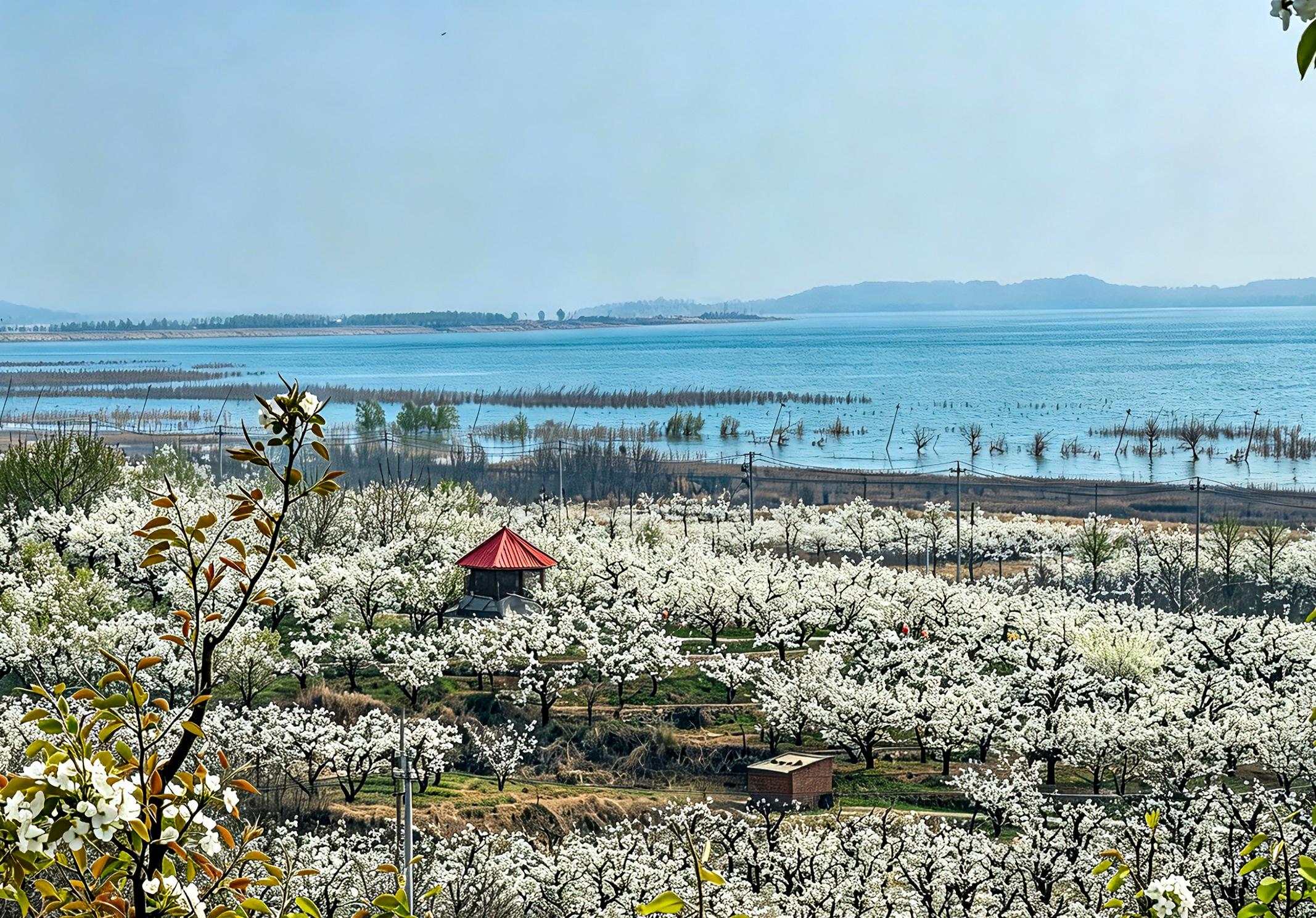 眼下,位于密云水库北岸的不老屯镇万亩梨花热情绽放,与密云水库蔚蓝水面相映成趣,景色如诗如画。