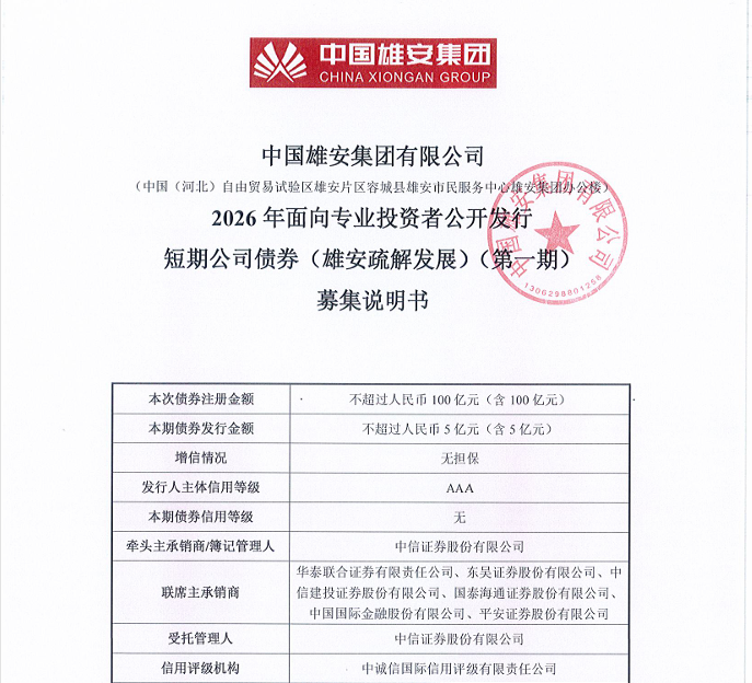 雄安集团具有北交所知名成熟债券发行人资质。作为雄安新区开发建设的主要载体和运作平台,在基础设施建设、产业疏解承接等方面发挥了重要作用。2025年12月15日,雄安集团100亿元短期公司债项目获中国证监会注册批复,本次发行为该项目的首期发行。