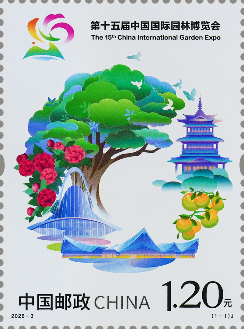 《第十五届中国国际园林博览会》纪念邮票以和谐共生为理念,表现了绿树、山茶花、瓯柑等植物元素以及本届园博会的核心园林景观和宣传标识。画面中,植物与场馆随曲线舒展,展现出人与自然相映相生的诗意格局,体现出中国传统“阴阳”哲学理念与融合共生的生态美学图景,蕴含了人文盛会根植于自然之道的文化内涵。