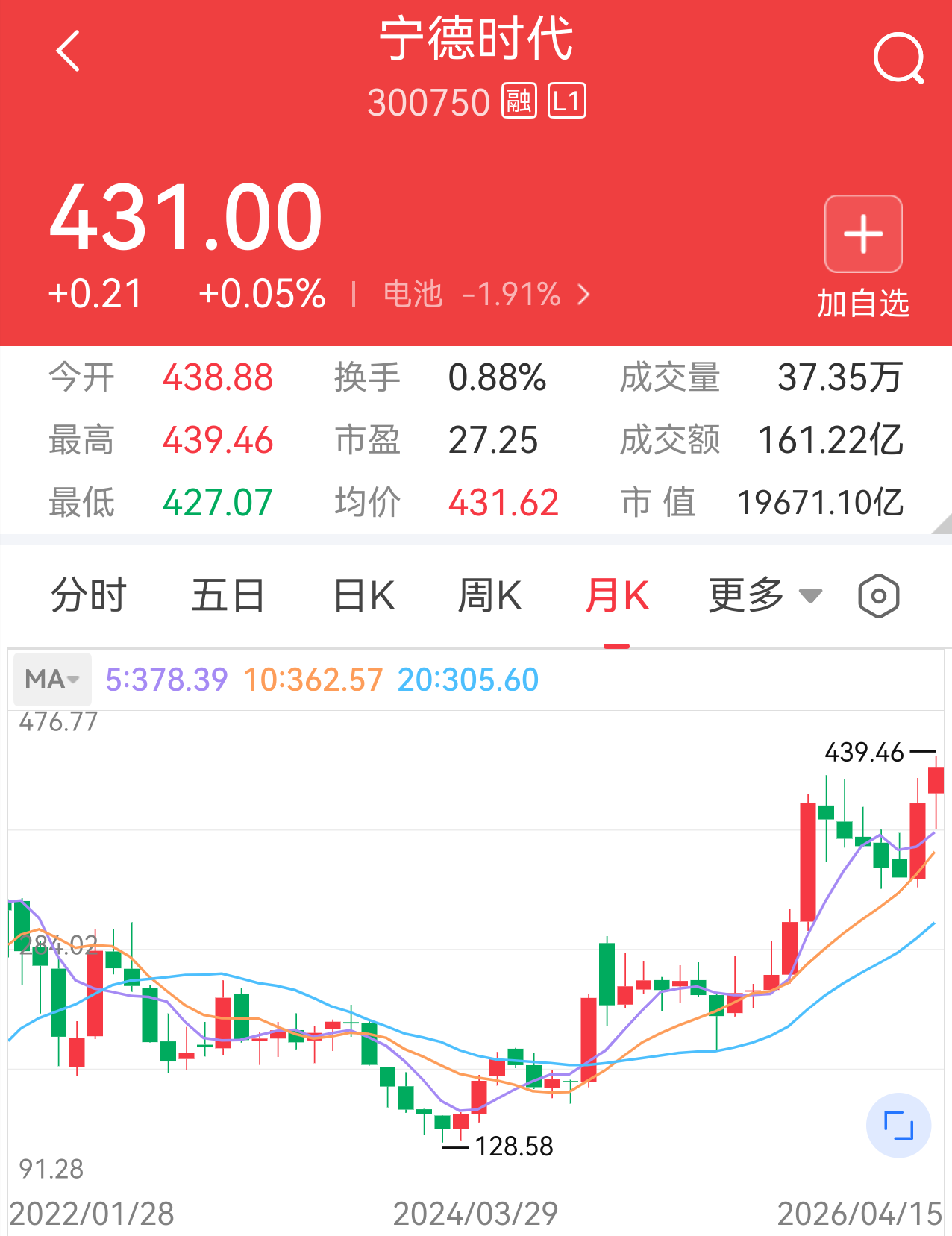 近期,宁德时代股价持续攀升。截至4月15日最新收盘,宁德时代A股报收于431元/股,总市值19671亿元,逼近两万亿元大关。