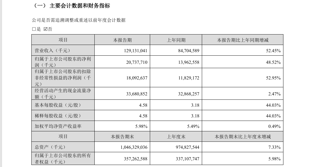 前不久,公司披露的2025年年报显示,去年营业收入达4237亿元,同比增长17.04%;归属于上市公司股东的净利润722亿元,同比增长42.28%;归属于上市公司股东的扣除非经常性损益的净利润645亿元,同比增长43.37%。