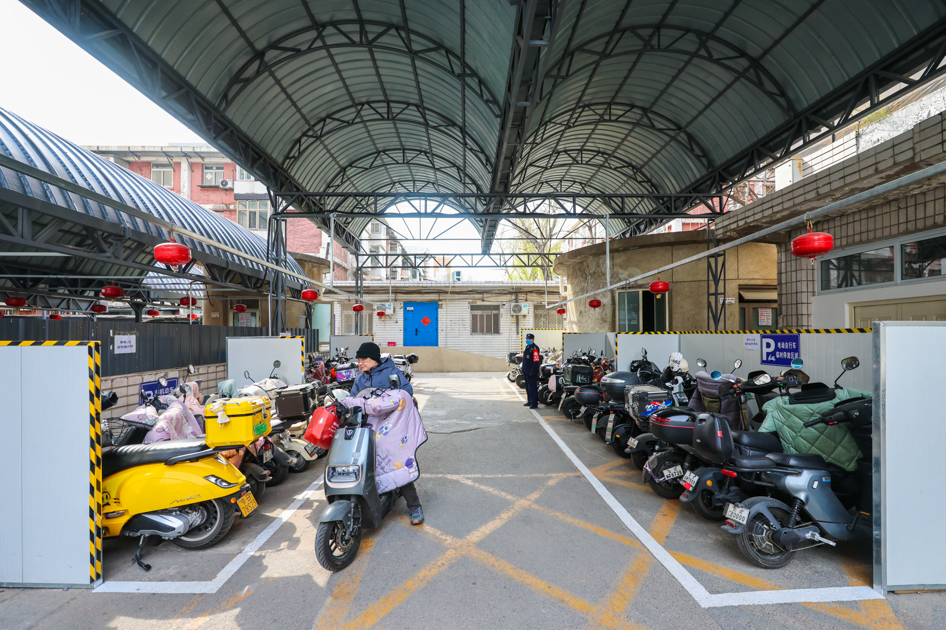 景山街道城市管理办公室副主任姬鹏翔介绍,商厦院内东侧与连丰胡同处,此前为违法建筑,景山街道将其拆除后一直闲置。今年3月,相关部门利用该空间新建两处电动车集中停放区,各配置40个充电桩接口,同步划定自行车、共享单车专属停放区域,约可满足100辆电动车、60辆自行车及共享单车停放,可满足80辆电动车充电。
