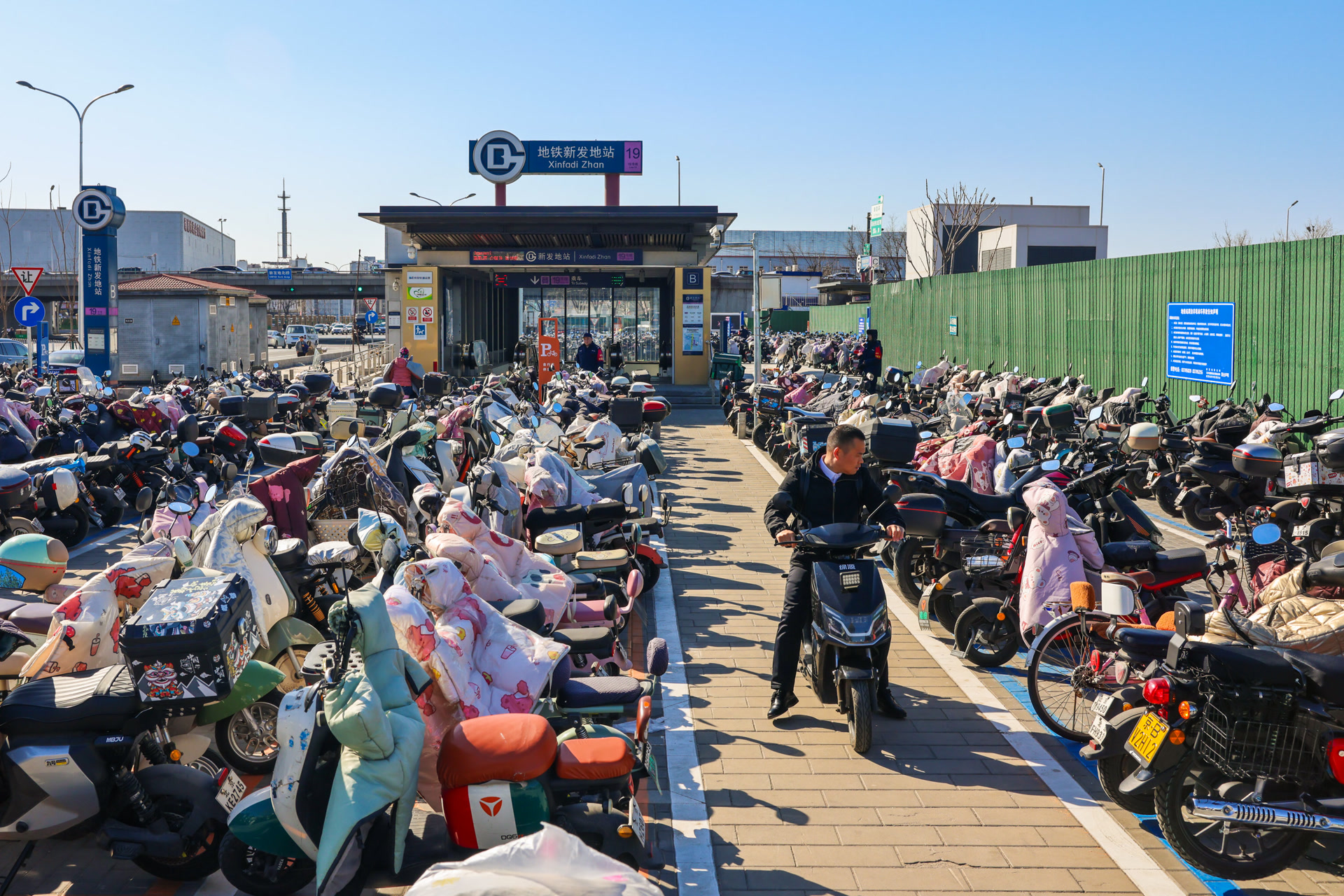 走出19号线新发地站,可以看到站前广场上一大片非机动车停放区,在地面划有蓝白框的一个个区域内,私人自行车、电动自行车有序停放。再看向远端路边,一个黄色牌子下,停放着一排共享单车,与市民车辆互不相扰。