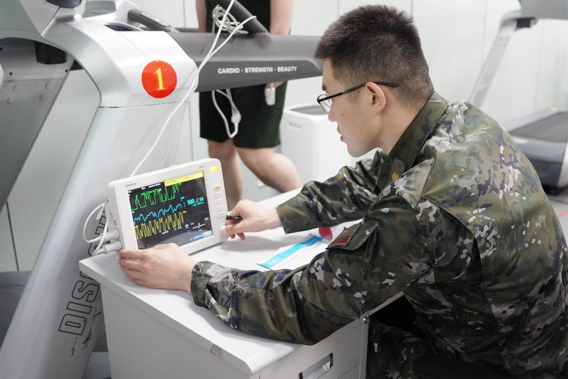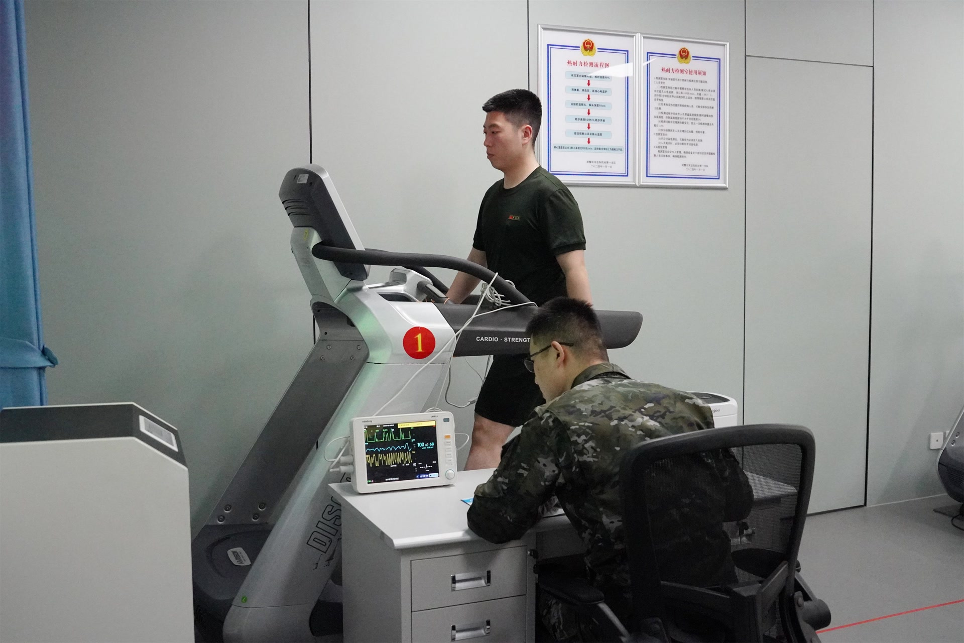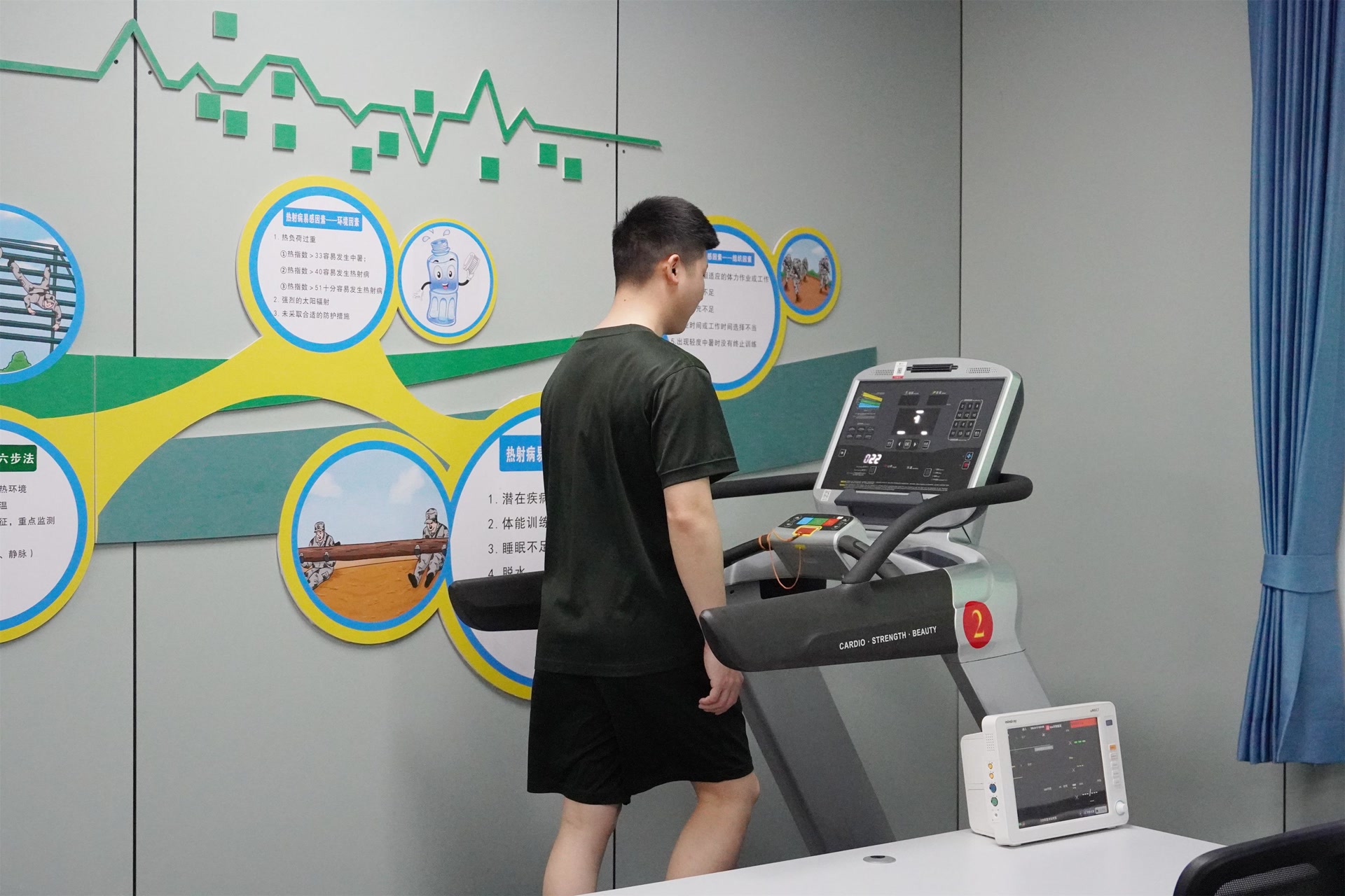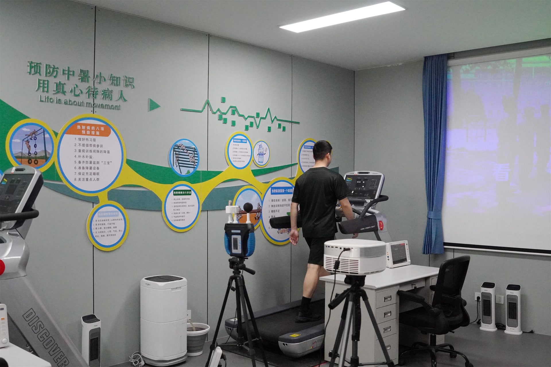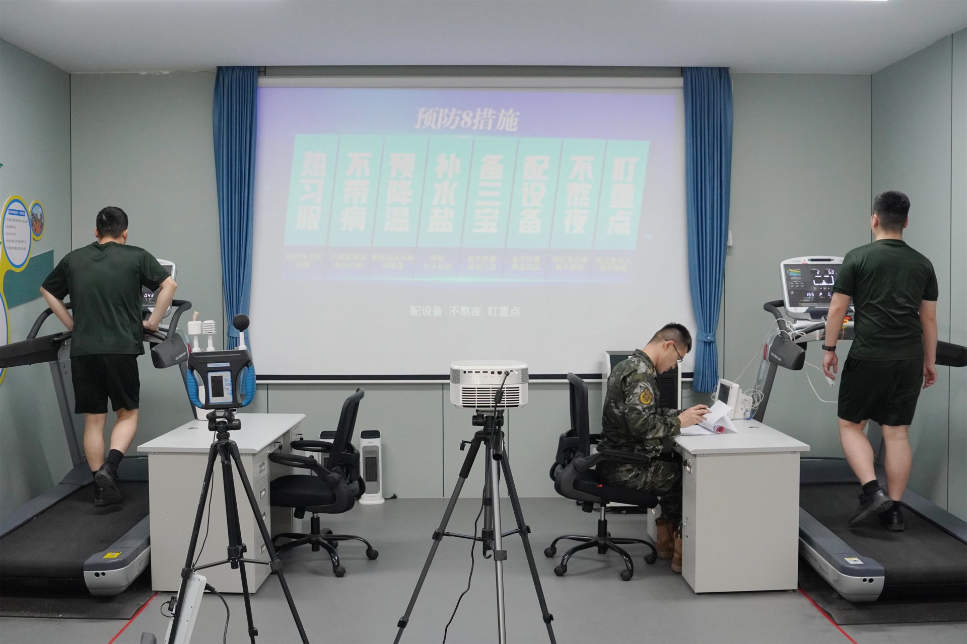 40℃的训练室里,跑步机上的官兵挥汗如雨,心率、体温、出汗量等数据在屏幕上实时跳动。支队卫生队定期开展热耐力测试,一方面帮官兵循序渐进适应高温、练出抗热“超能力”;另一方面为科学组训提供精准数据,有效预防高温训练伤,还能科学评估热射病康复战友的恢复情况,确保他们安全归队。