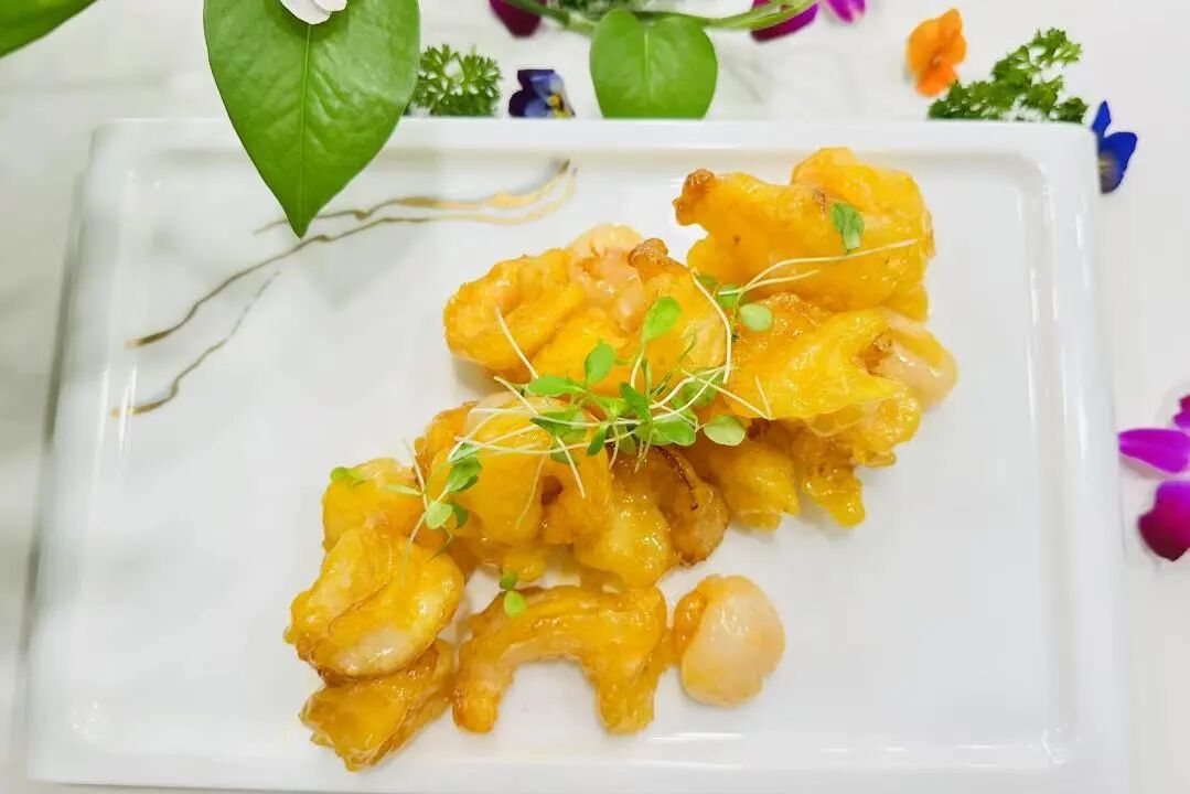 三层:招牌烤全鱼、北京烤鸭、荔枝爆浆虾球