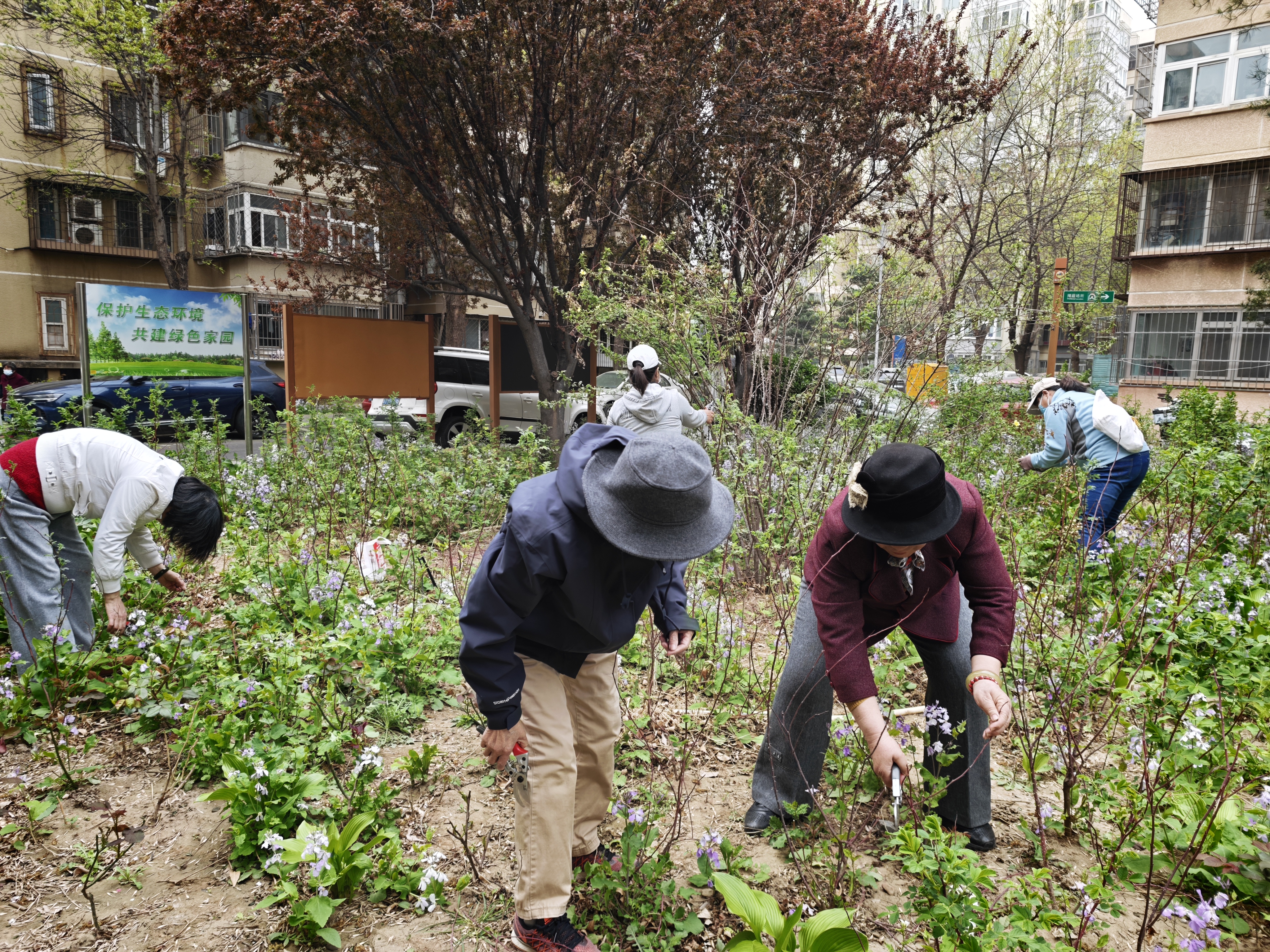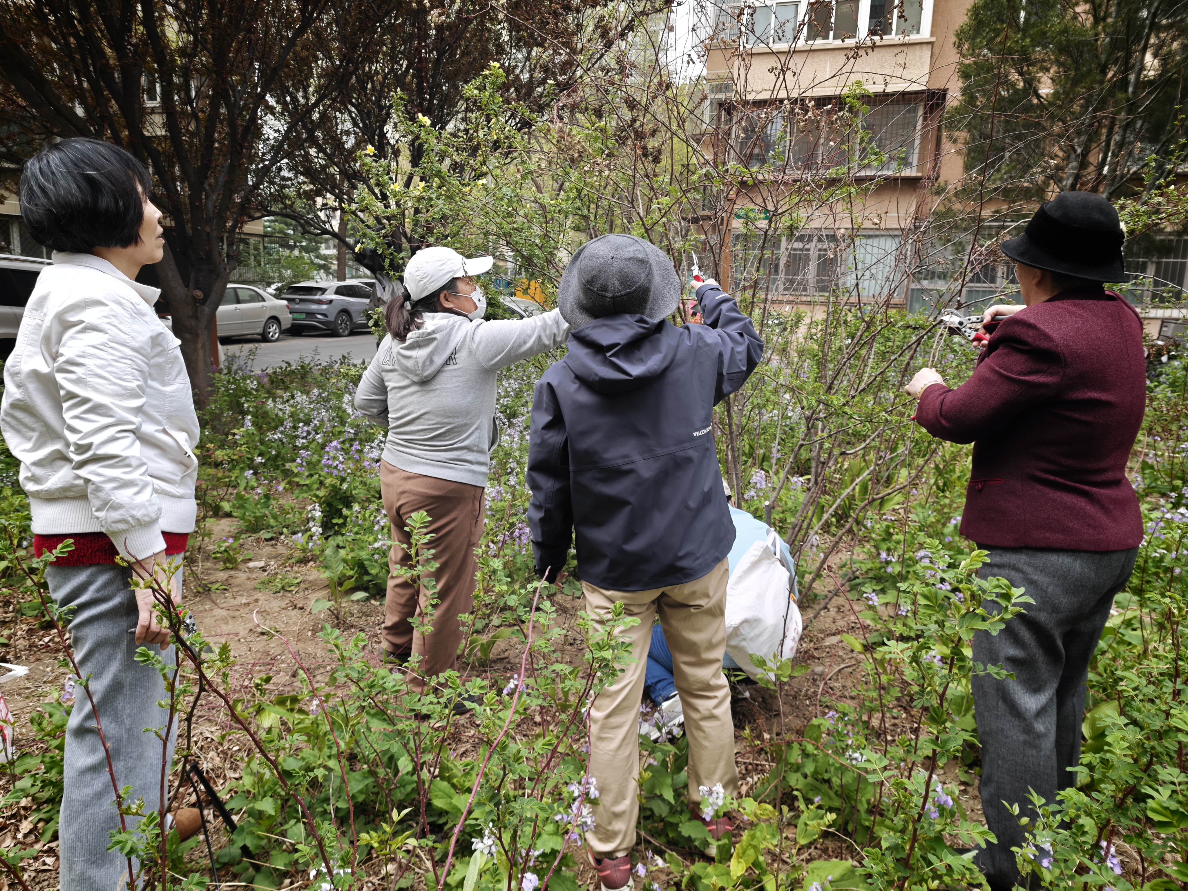 “等到五六月份月季、玫瑰盛开的时候,又是另一番美景,这两处花池就成了居民们最爱来的地方。”73岁的陶丽蹲在花池里,熟练地剪掉一根干枝,笑着说。