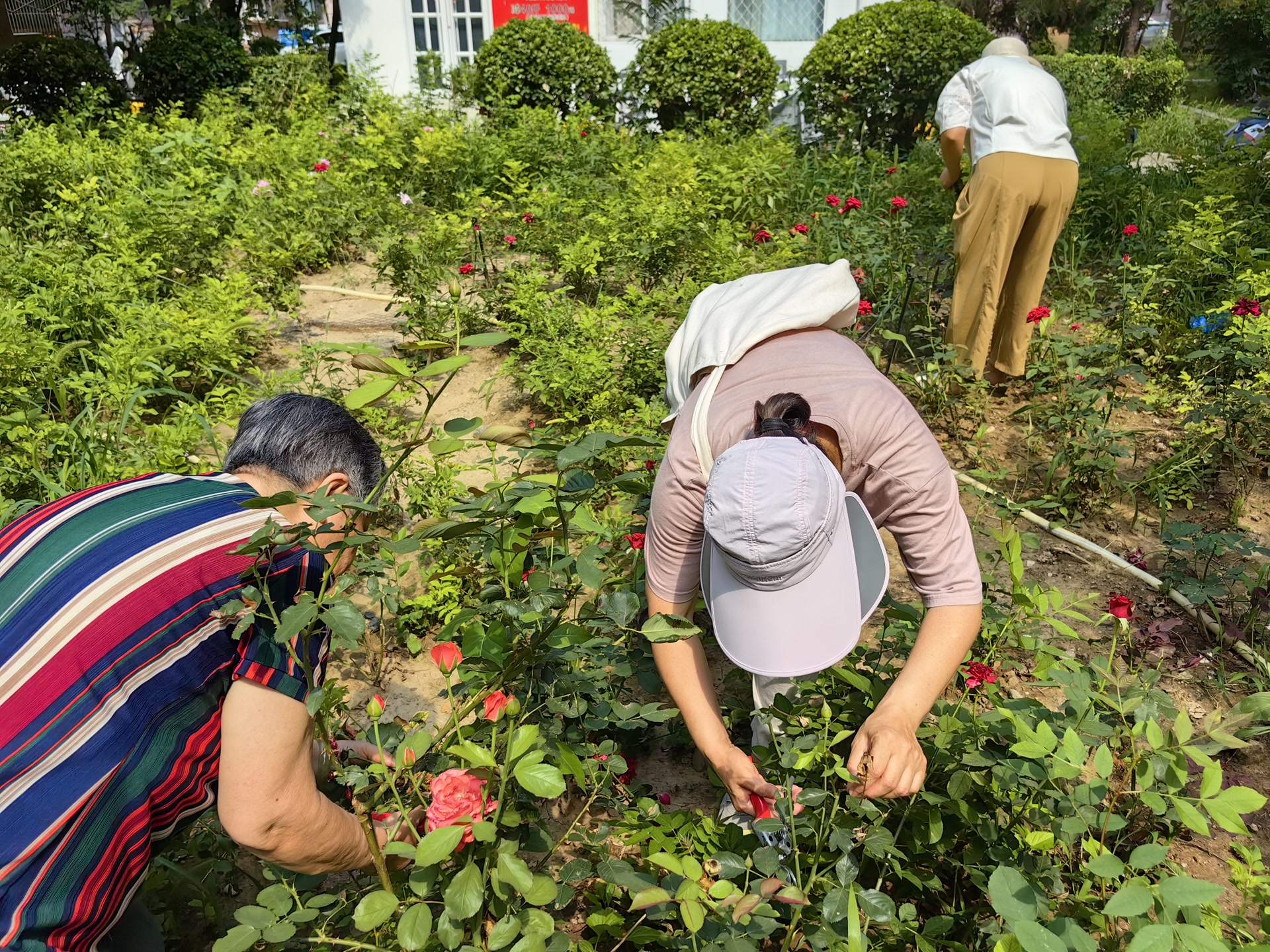 改造过程并不轻松:月季园地下全是石头瓦块,土质极差。住在一层的高春红主动带头,一锹一锹手工清理土块瓦砾;又运来营养土,一点点把荒地改造成花田。