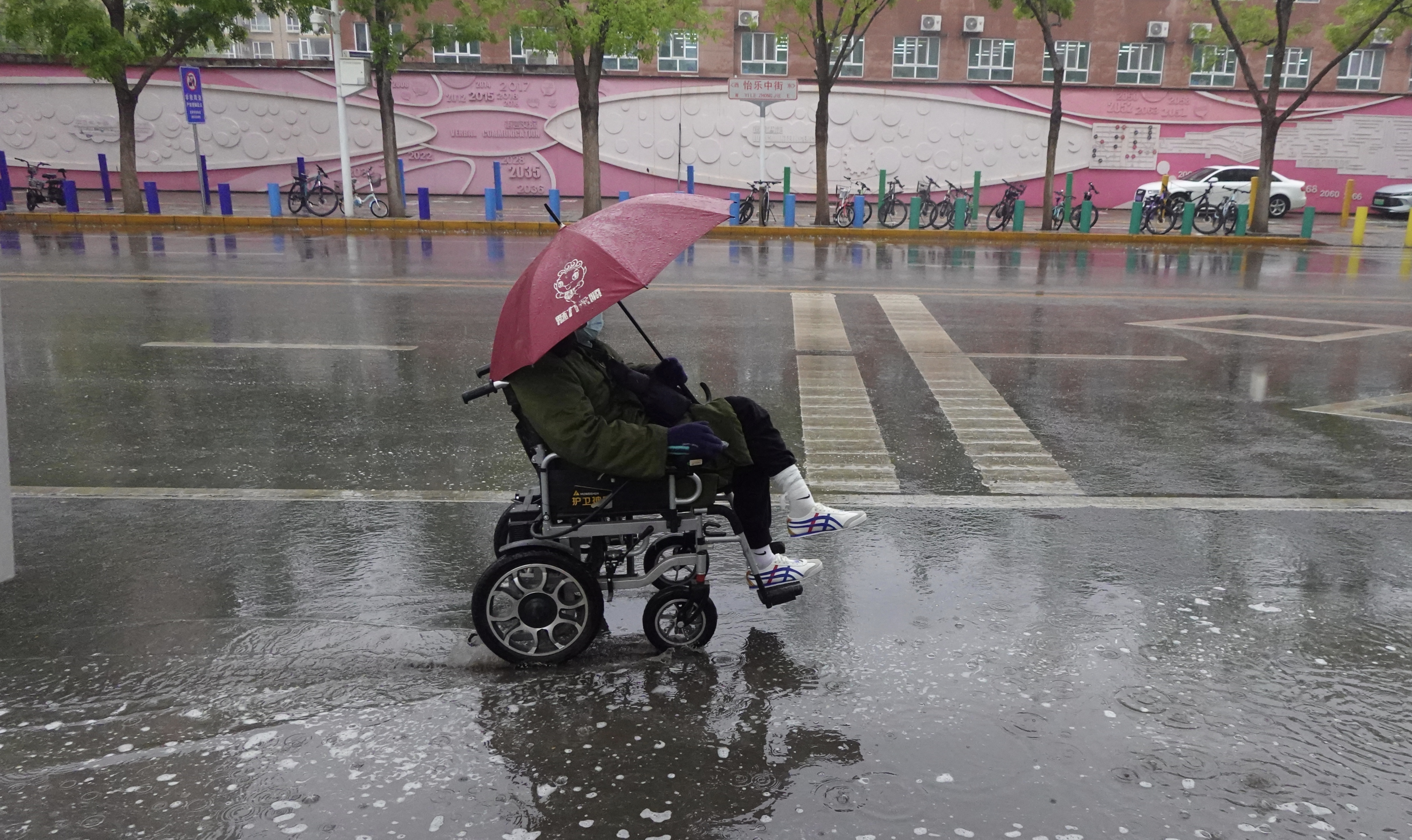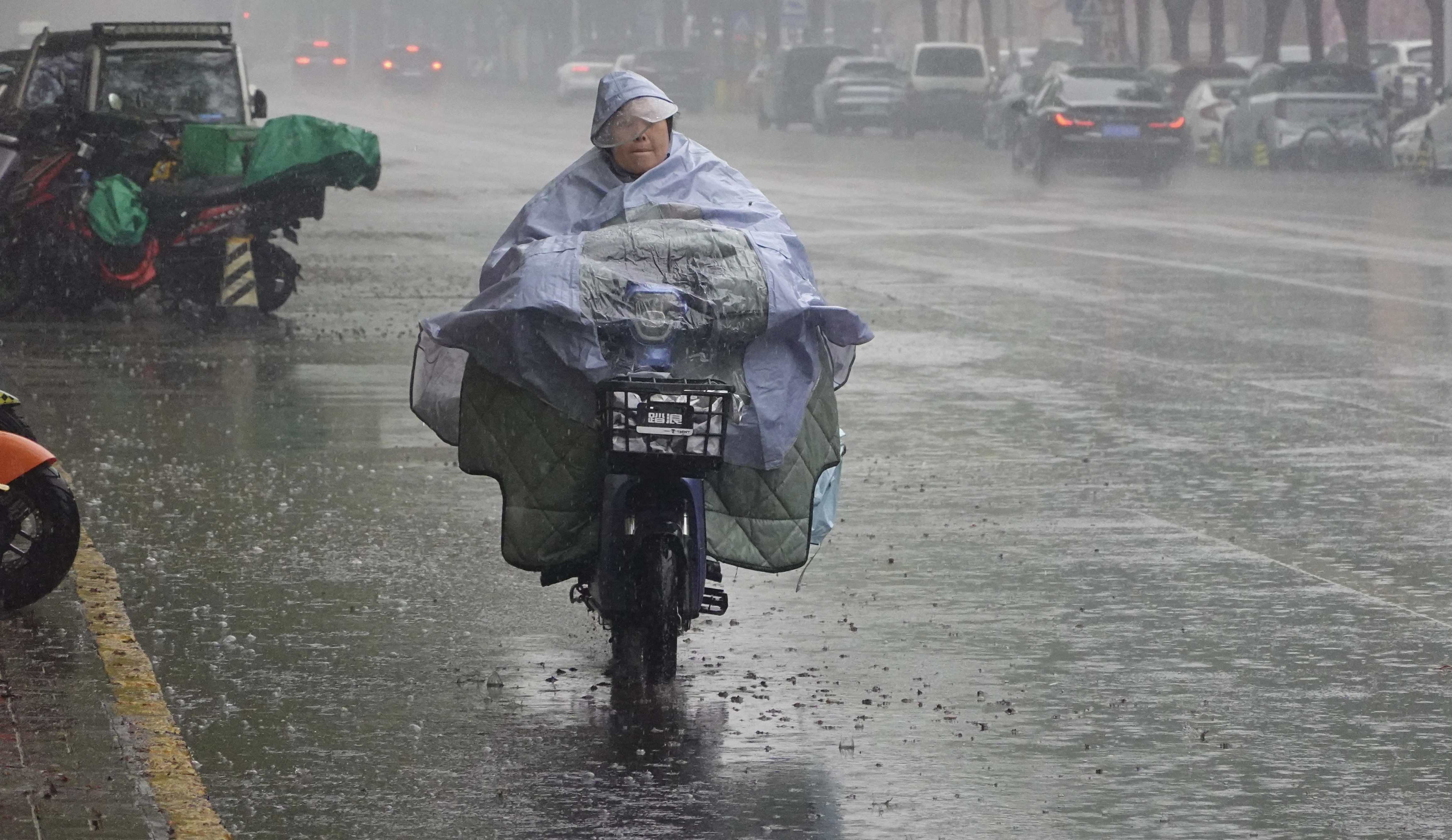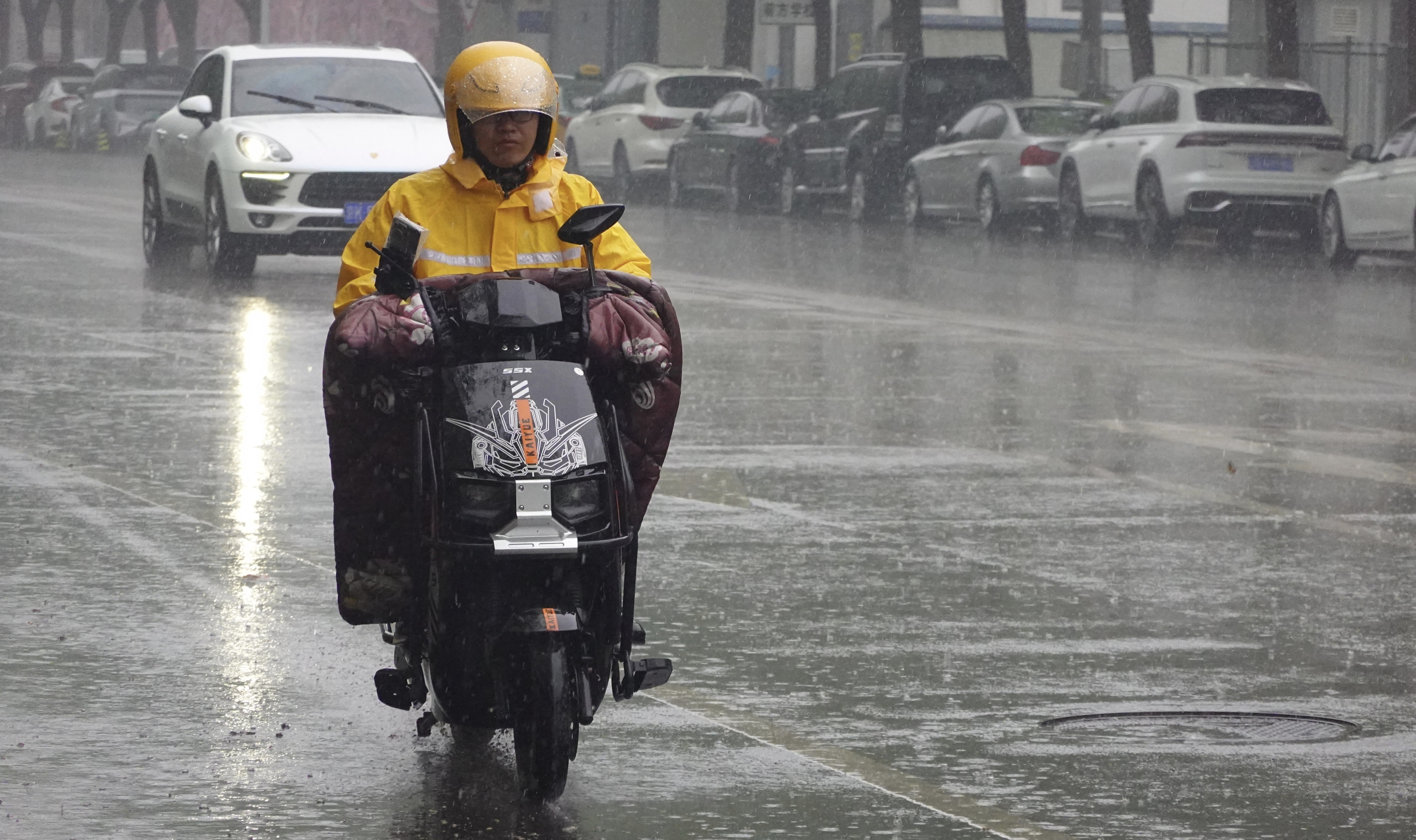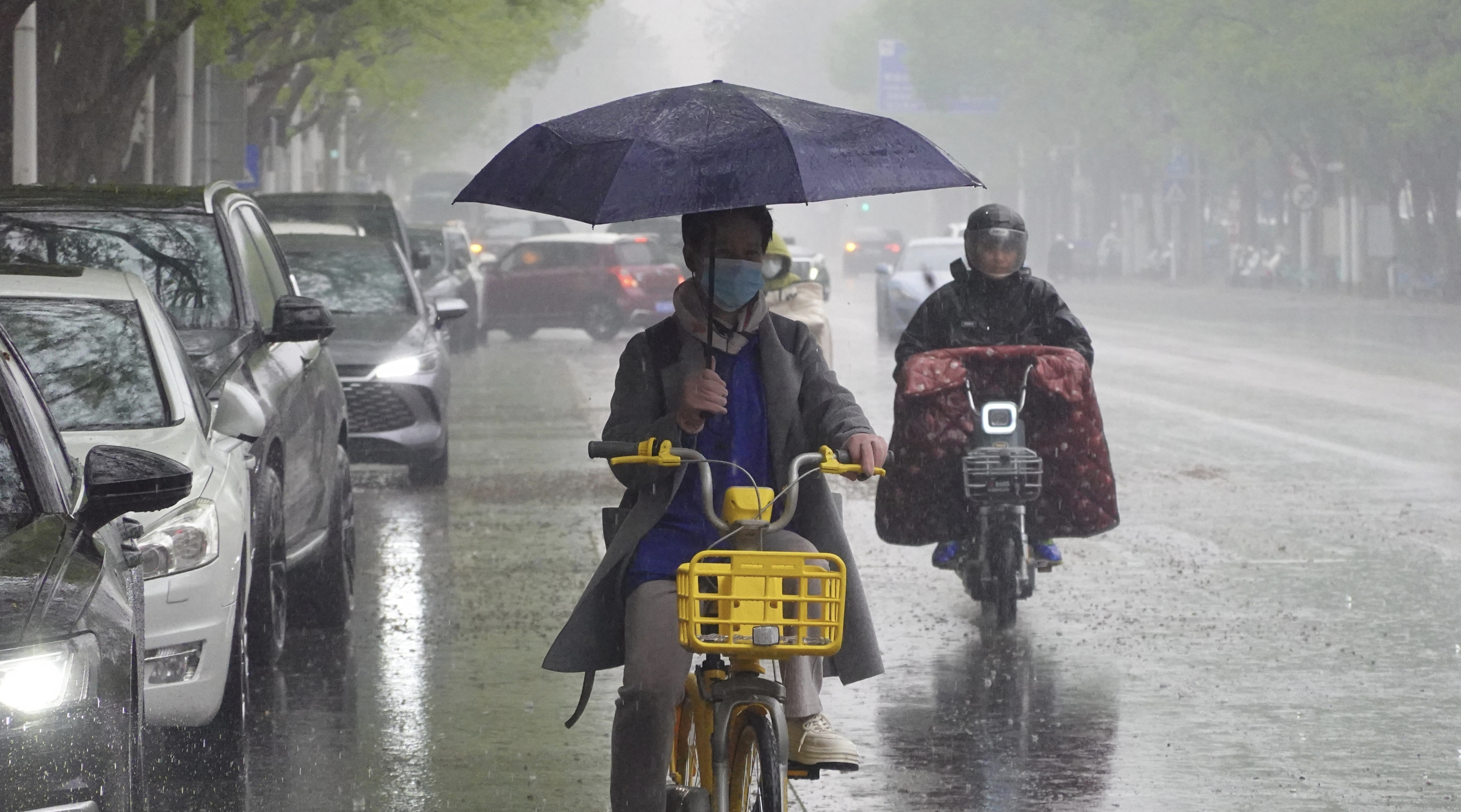 4月16日中午,北京通州九棵树,行人、外卖骑手在雨中行进。虽说春雨贵如油,但也给人们出行带来困扰。