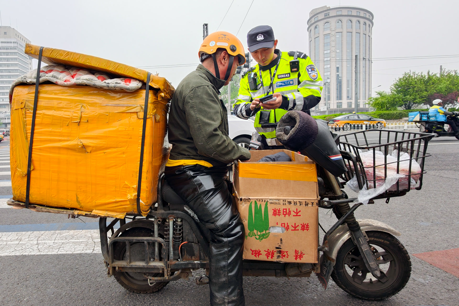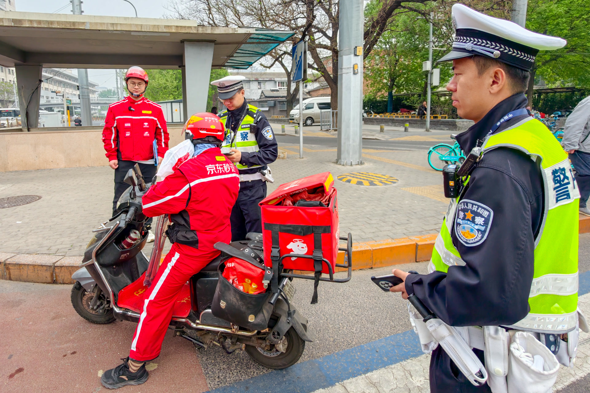 执法现场,外卖平台工作人员也在逐一登记违法骑手的姓名、车牌号、站点及违法行为。京东秒送北京天桥骑手组站长秦壮壮说,他每周在片区路口开展1至2次抽查,将违法信息推送至对应站点,由站长组织骑手专项培训。首次违法者将面临停岗培训两小时,第二次违法就将停岗一天,学习合格后方可恢复接单。此外,公司还设立了“安全文明奖”,对整月无违法的骑手给予奖励。