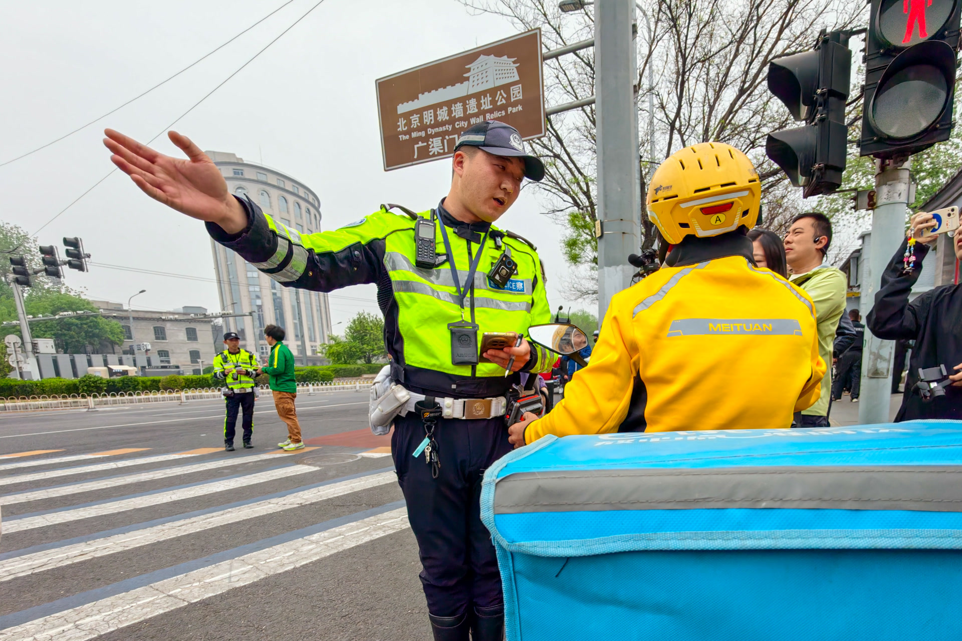 上午9点多,崇文门路口人流车流密集。这里毗邻同仁医院、北京医院、崇文门商圈及多个旅游景区,外卖取餐点集中,是骑手违法高发路段。