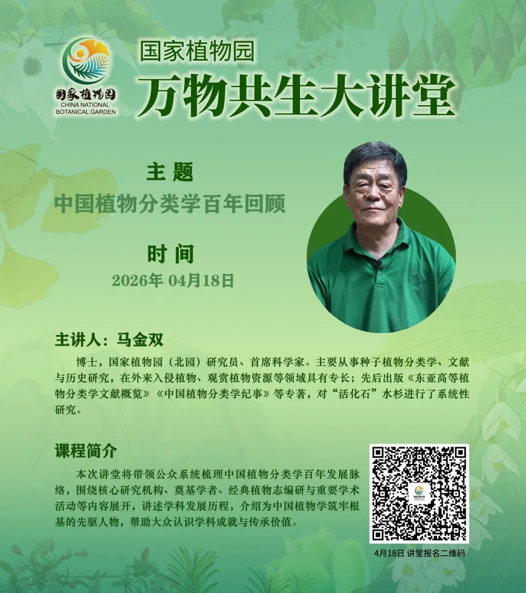 本次讲堂将带领公众系统梳理中国植物分类学百年发展脉络,围绕核心研究机构、奠基学者、经典植物志编研与重要学术活动等内容展开,讲述学科发展历程,介绍为中国植物学筑牢根基的先驱人物,帮助大众认识学科成就与传承价值。