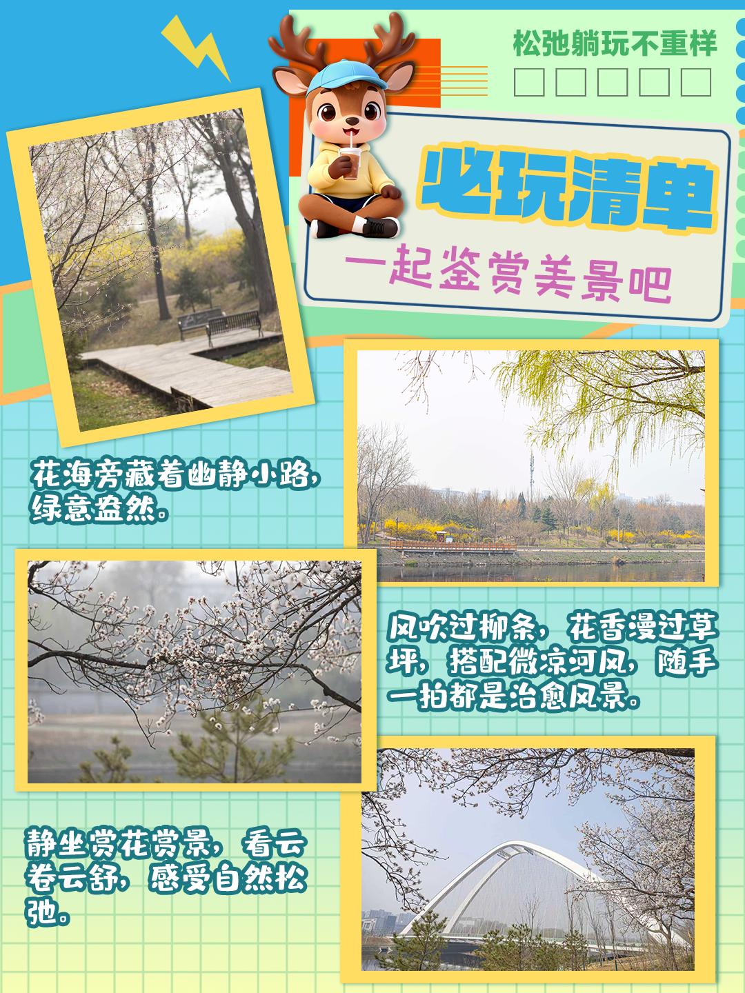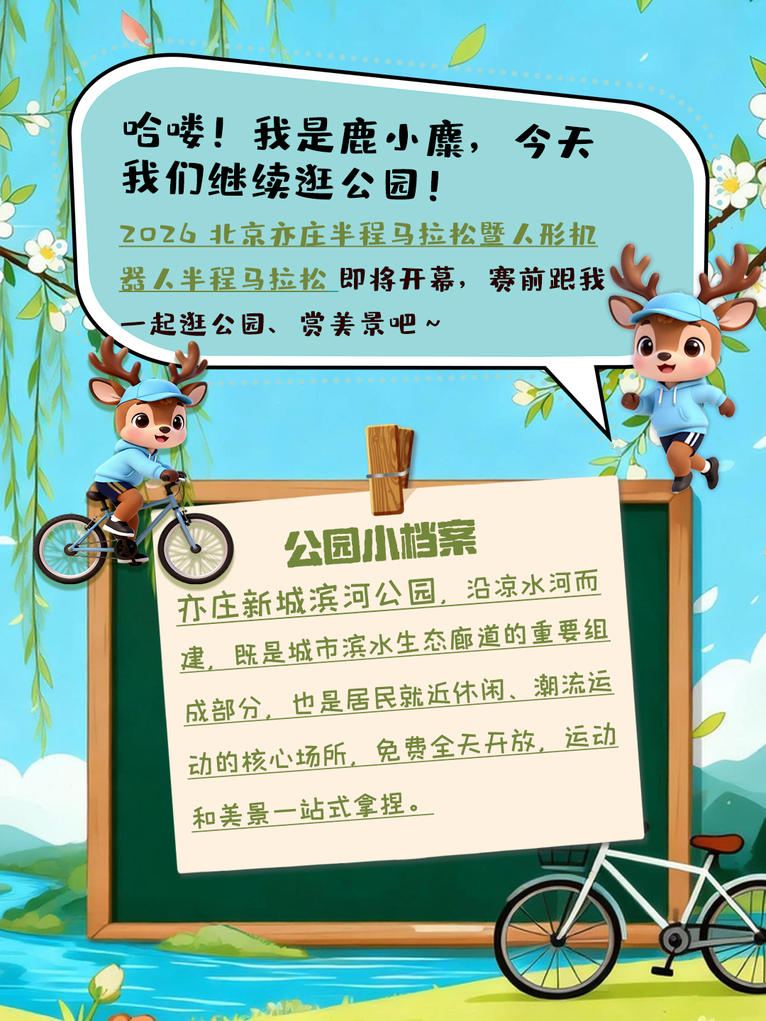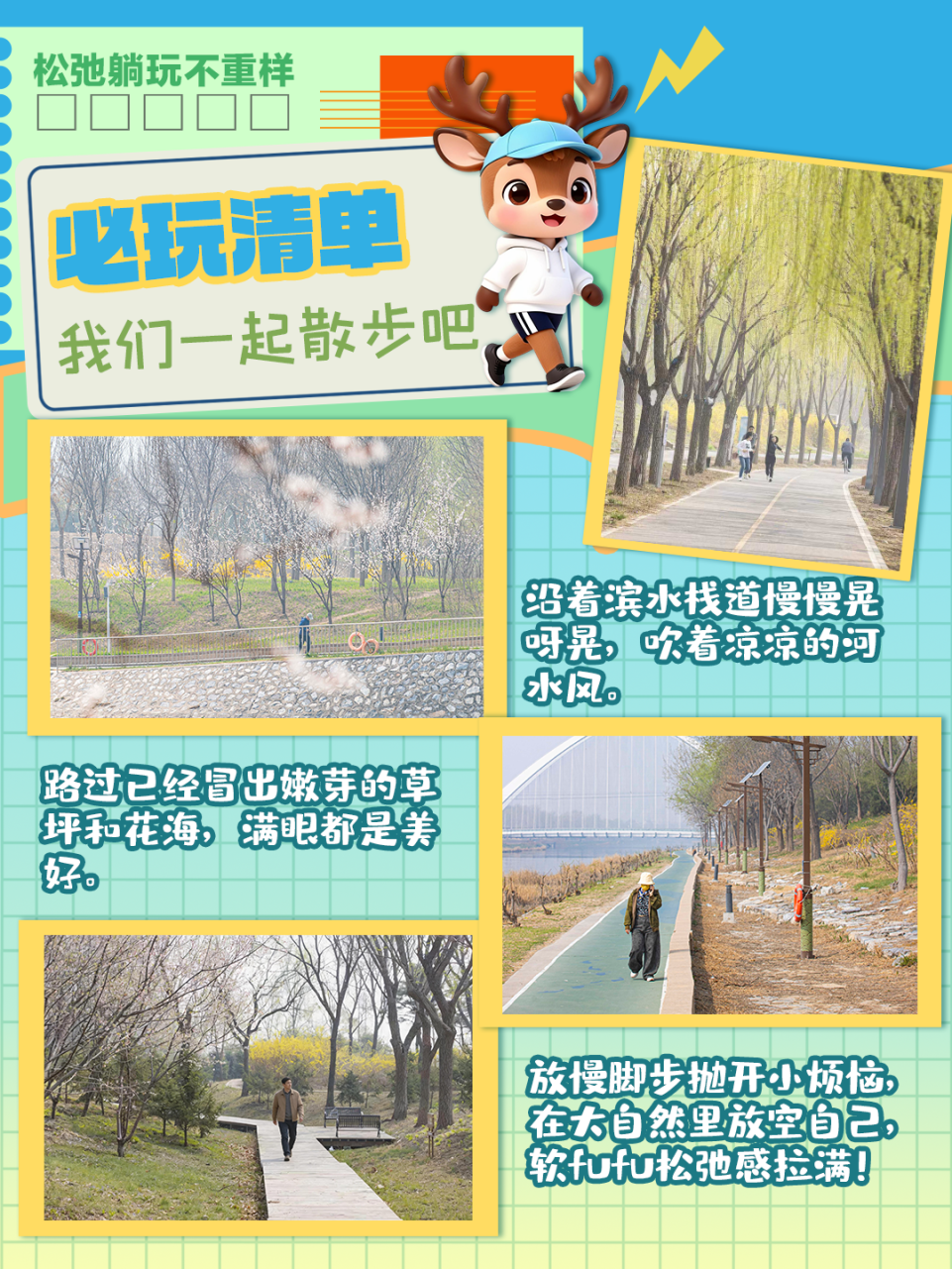 欢迎来到“城市绿肺漫游指南”!鹿小麋带您逛我家~今天,我们一起走进亦庄新城滨河公园,解锁松弛感满分的春日漫游!
