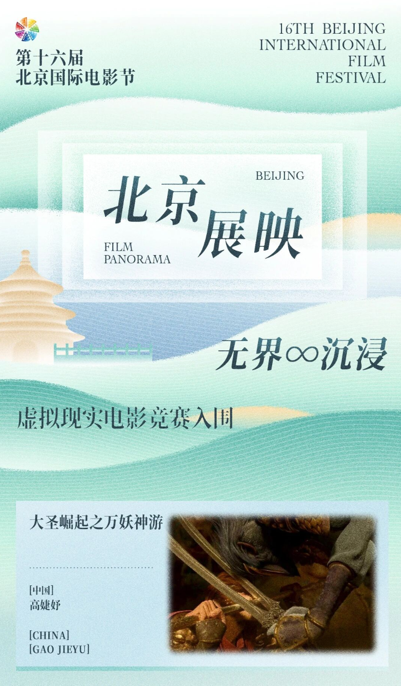 4月16日,第十六届北京国际电影节正式开幕。由君看文化出品、AI-Envision工作室创制的XR超感虚拟现实影片《大圣崛起之万妖神游》,凭借对东方神话IP的深度文化转译与前沿交互技术的融合创新,入围“无界∞沉浸单元”虚拟现实电影竞赛单元。
