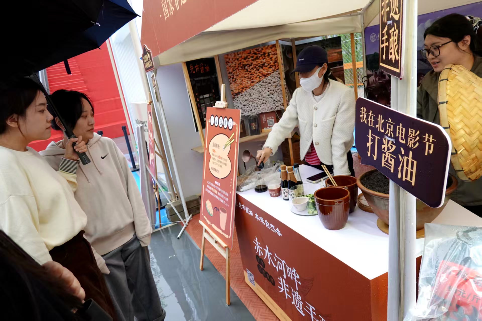 市集上的美食专区从甜点小吃到咖啡酒水应有尽有,最有趣的是在角落里两家低调卖手工酱油和醋的摊位。来自四川的酱油摊位主理人一边向游客介绍传统缸晒酿造工艺,一边请大家互动夹黄豆的小游戏;卖醋的摊位更是提供了十余种果醋、陈醋请走过路过的游客尝试。虽然49元一瓶的手工酱油和最低40元一斤的果醋价格不菲,但这两个摊位迅速成为市集上的“反差担当”,游客们本是来电影节感受艺术氛围,却意外地被酱香和醋香“勾住了脚”。“我们是来电影节打酱油的,没想到真在这里买了酱油。”两位年轻女孩一边扫码付款一边“自嘲”,此话一出惹得周围人一起哈哈大笑。一位特意来北京参加电影节小伙子被这边的热闹吸引,也跟着感慨道:“一边是博物馆文创,一边是接地气的酱油醋,还一点不违和,咱就说这文艺的生活很入味。”