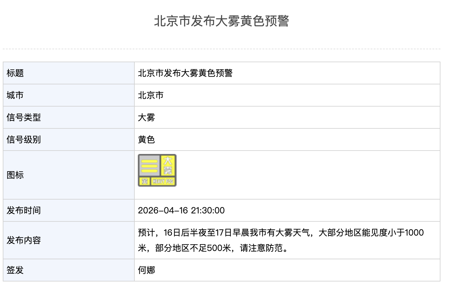 北京大雾黄色预警!大部分地区能见度小于1000米