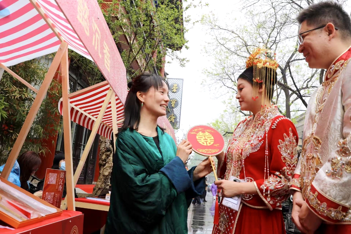 活动现场,“椿庭囍市——2026年甜蜜经济市集”热闹开市,汇聚菜百首饰、荣宝斋等50家企业,涵盖婚纱、婚俗、非遗体验等五大品类,设置集章打卡、互动游戏等多元环节,传统婚俗文化与现代潮流碰撞交融。
