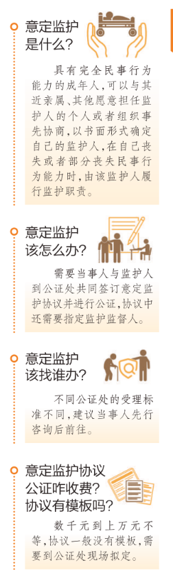 现在,姚女士在寻找监督人这一点上仍然面临困难。而这个问题,或许在不久的将来能得到解决。即将于7月1日施行的《北京市养老条例》提到,“鼓励老年人按照《中华人民共和国民法典》的规定与相关个人或者组织协商确定意定监护人。本市采取措施支持、指导、监督老年人的监护人履行监护职责。”