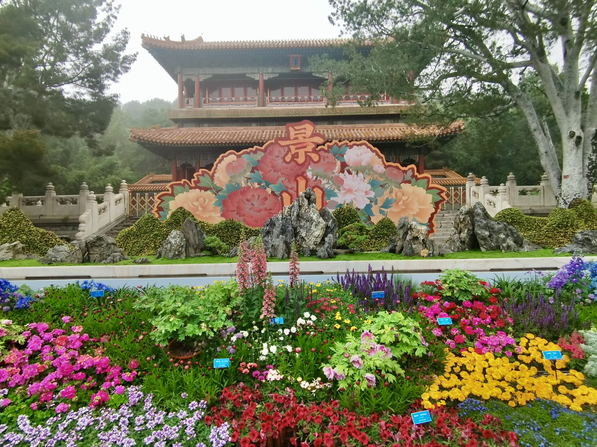为丰富游园体验,牡丹文化节期间,“牡丹路”沿线精心打造了主题花卉景观。南门区域以大型山水盆景为基底,构建“国色凝芳”主题景观,运用植物造景手法,结合地势起伏与留白层次,营造出开阔舒展的视觉效果。景观后方设立牡丹主题小品,将万春亭中轴地标与盛放牡丹巧妙融合,构筑“仙山藏花”的诗意场景。漫步此间,国色与古建同框成景,市民游客沉浸式赏花的同时,也能细细品味历史名园独有的庄重与典雅。