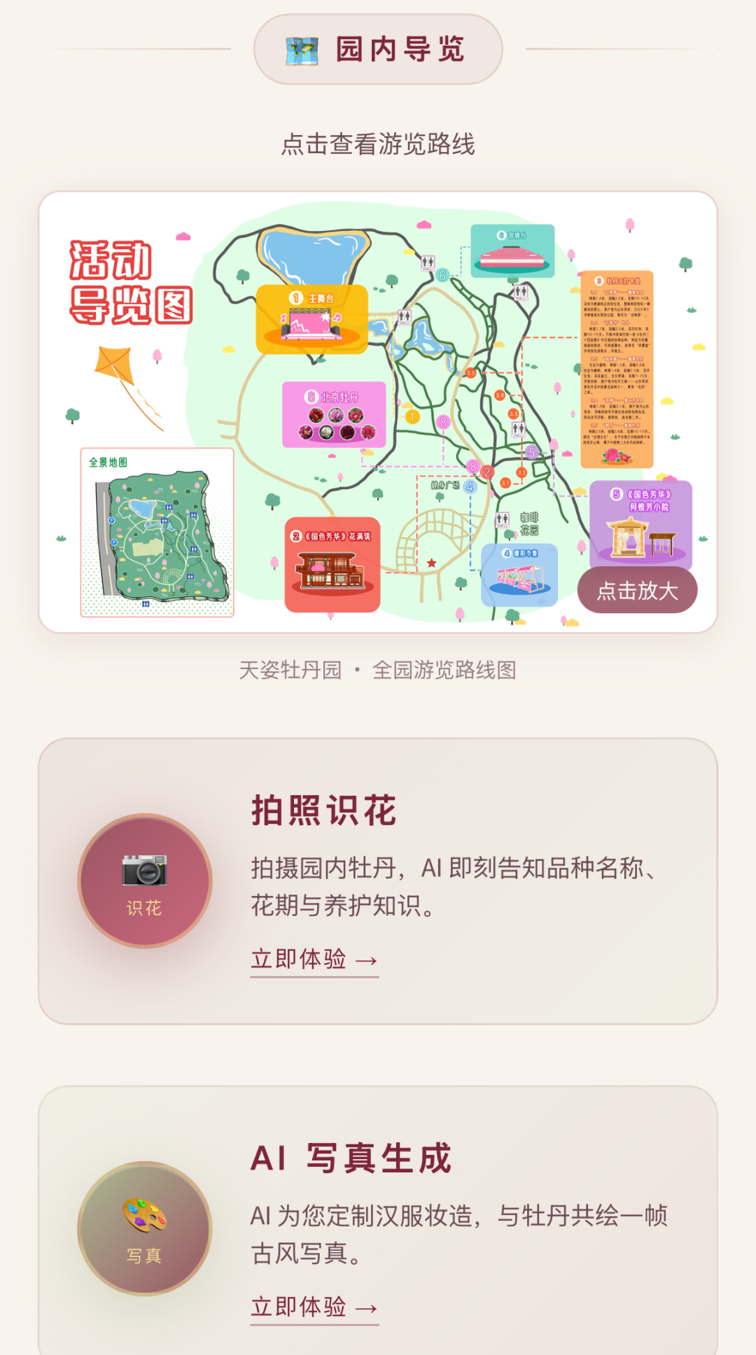科技赋能让游园更智慧。地区联合北京邮电大学推出“智绘国色·卓越邮我”科技赋能行动,让AI、机器人、AIGC等前沿技术走出实验室,融入市民游园体验。“智游花海”AI互动导览平台化身“随身导游”,扫码即可获取智能导览、牡丹科普与AI识花问答。