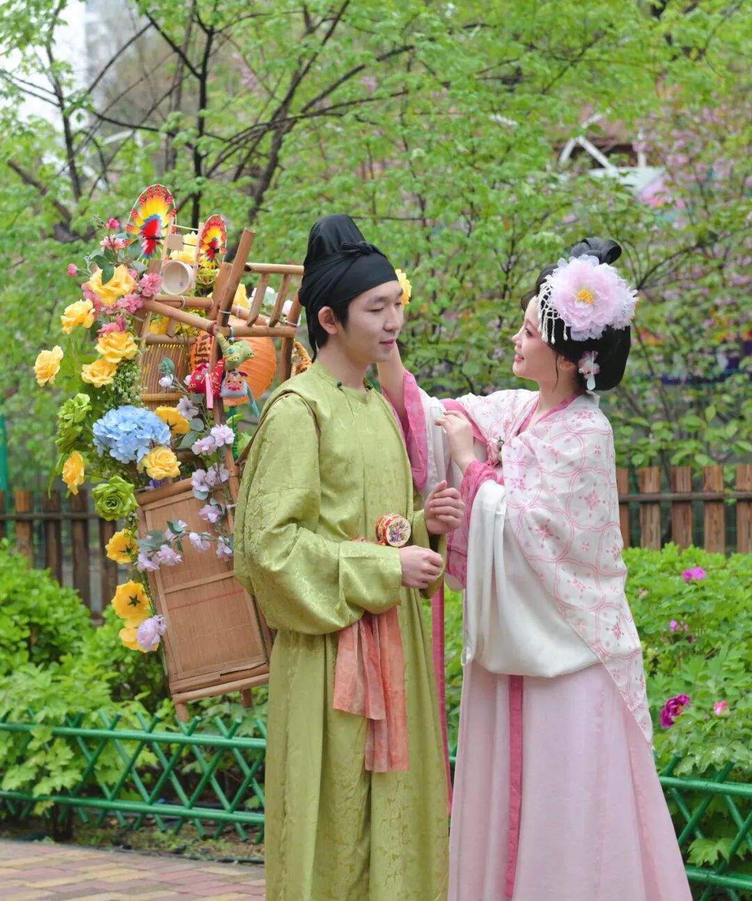 花间步道上,两位簪花郎沿路巡游。游客皆可零距离加入其中,与簪花郎并肩同行,赏春光、接鲜花、拍美照,体验一把春日限定的穿越之乐。