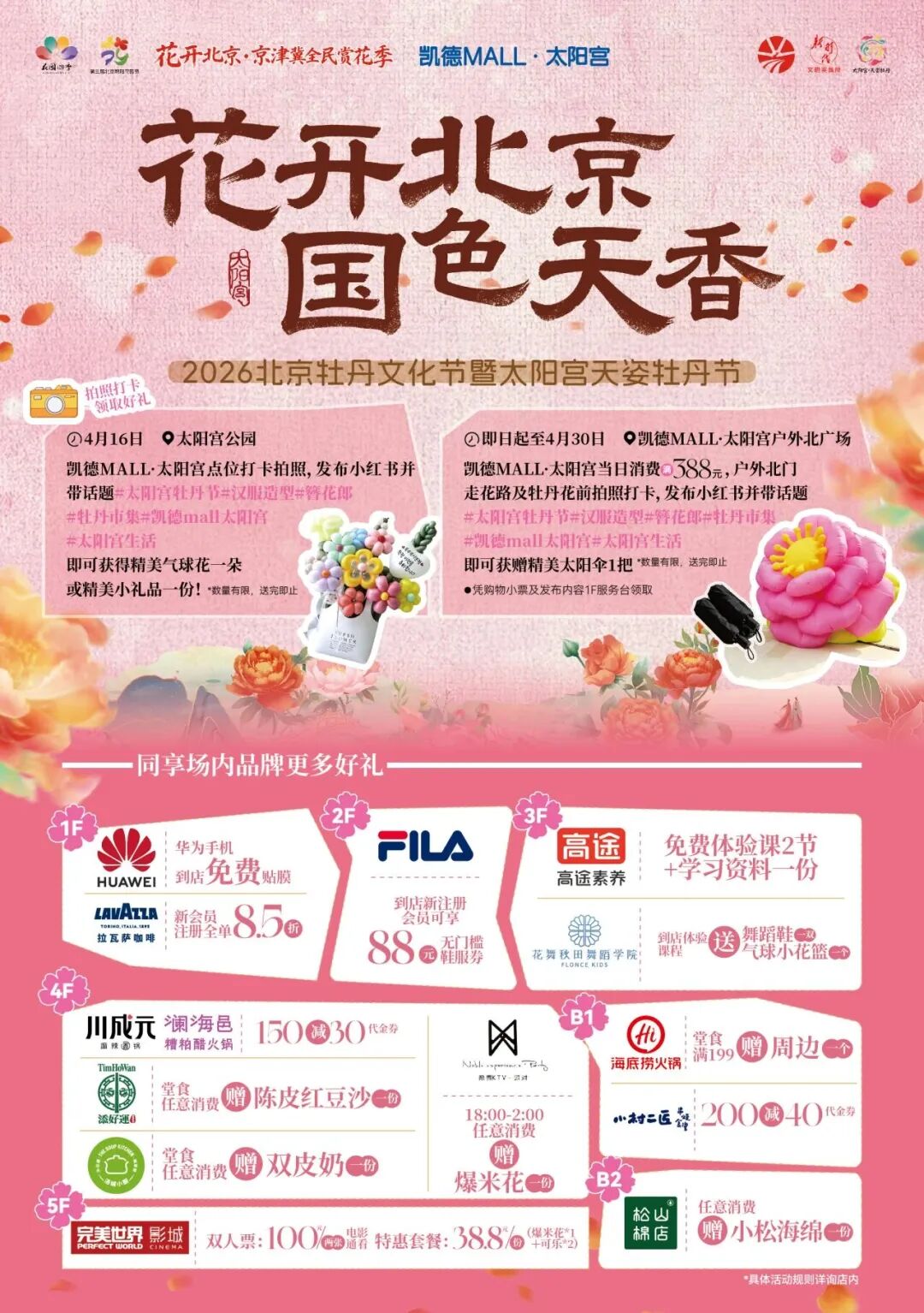 美食体验同样丰富。牡丹精酿啤酒、牡丹鲜花饼、牡丹花蕊茶等牡丹系列产品集中亮相,朝鲜族冷面、哈尔滨红肠、绍兴花雕酒等各地风味小吃一应俱全,花香与烟火气交织。现场还设置金标大众两款新能源汽车展示区,供市民咨询试驾,丰富游园场景。地区还联合凯德MALL·太阳宫店推出联动打卡活动,市民拍照发布社交平台即可领取春日好礼~