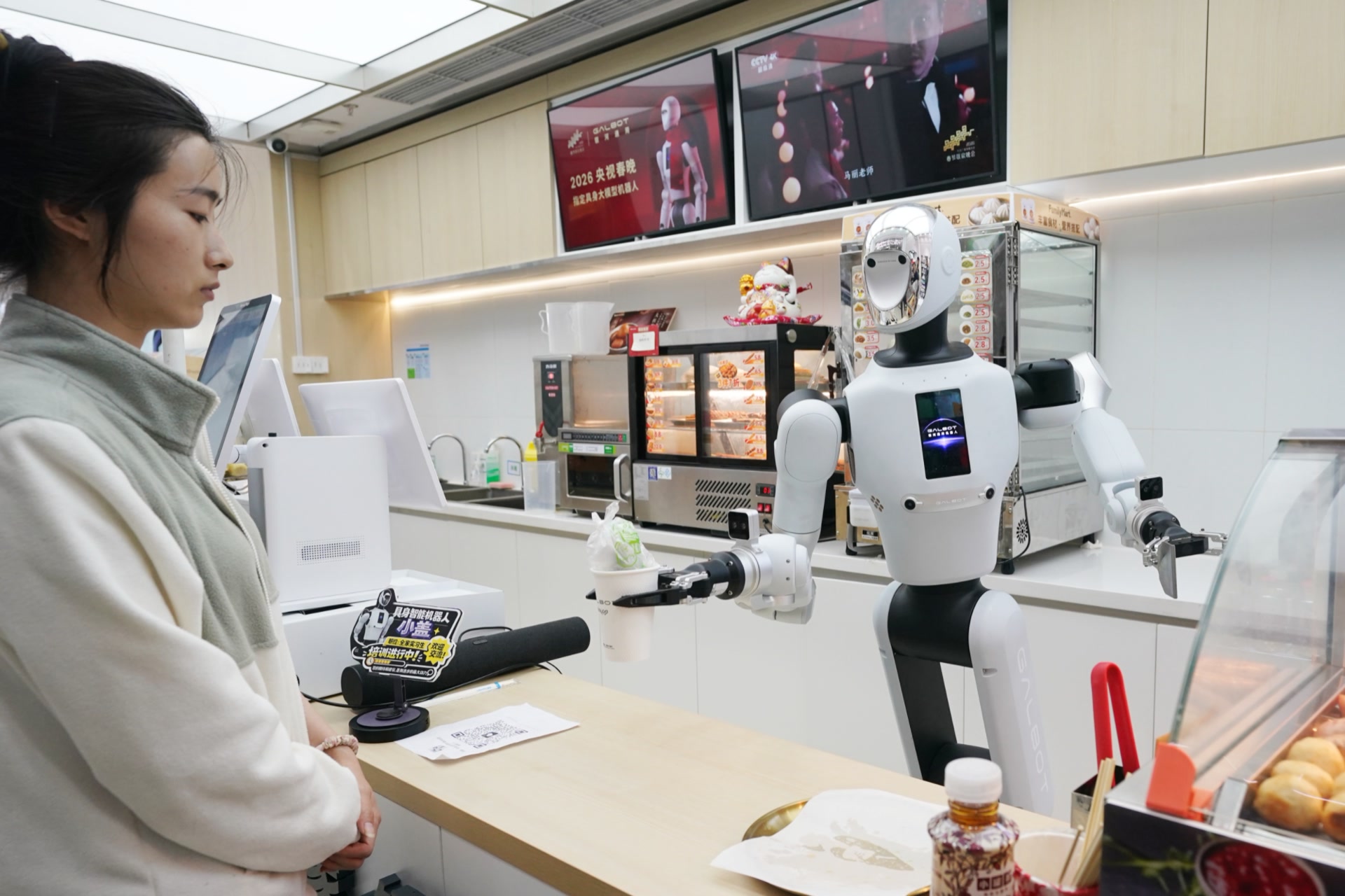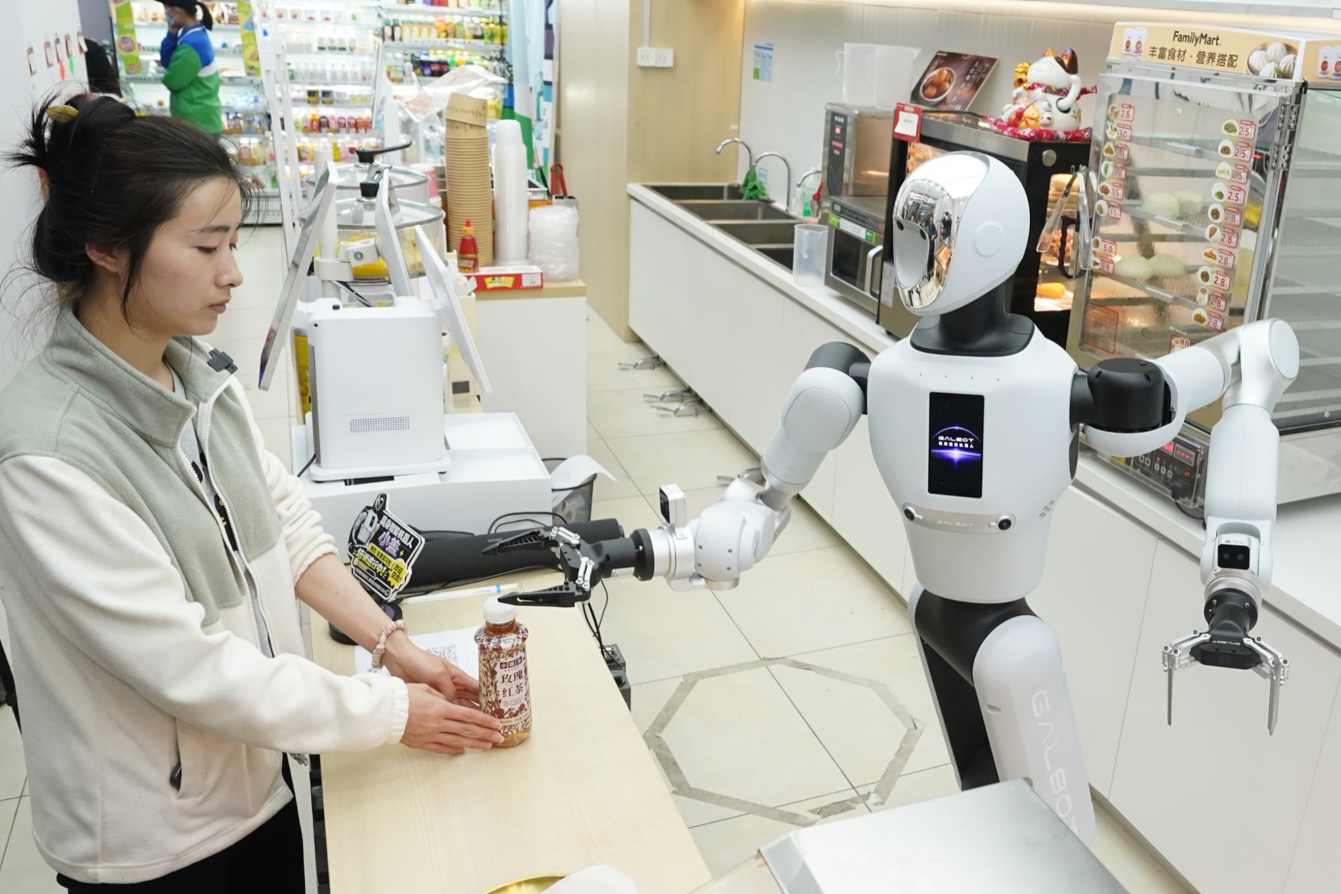 走进全家中关村鼎好店,迎面的C位就是银河通用机器人Galbot G1,背后的大屏上,循环播放着该款机器人在春晚上与沈腾合作的场景。作为常态化的“店小二”,Galbot G1负责店里的饮料、烤肠等热食售卖。
