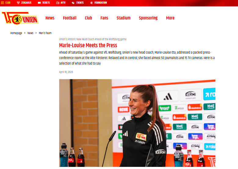 北京时间4月18日晚,柏林联合队将在本赛季德甲第30轮比赛中主场迎战沃尔夫斯堡队。这场积分榜中下游球队之间的较量,已经成为当轮最受关注的比赛——柏林联合男足队主教练、德甲乃至欧洲五大联赛男足首位女性主教练玛丽-路易丝·埃塔将上演执教首秀。