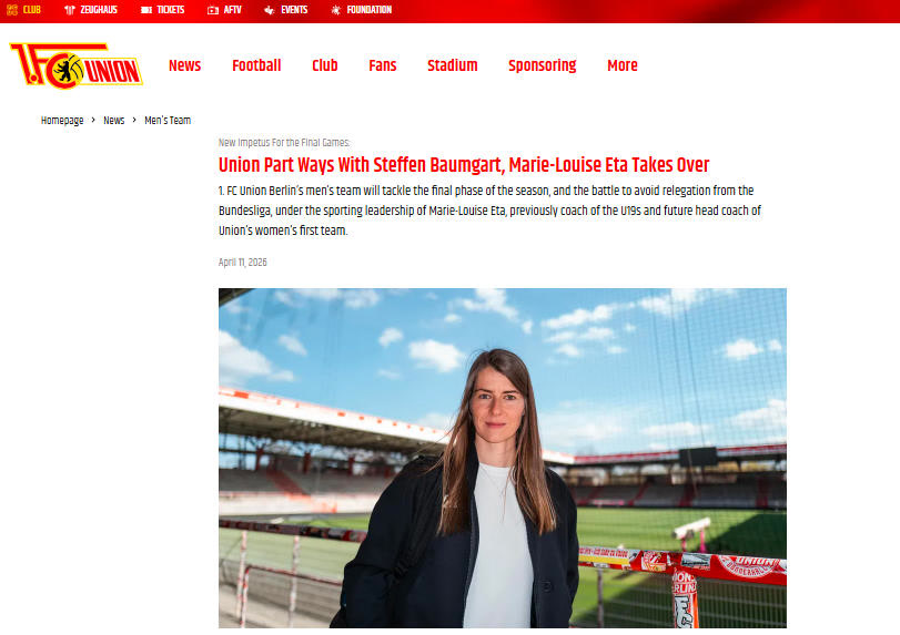 4月11日,在今年进行的14场联赛中只赢下2场、拿到11分,仅领先降级区7分的柏林联合队宣布换帅:执教球队一年多的鲍姆加特被解雇,俱乐部U19梯队主帅埃塔成为一线队主教练。