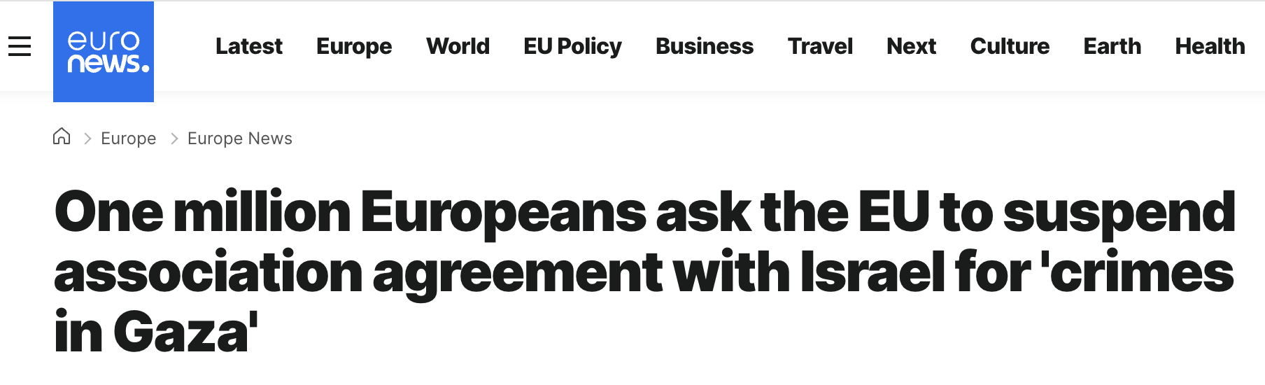 欧洲新闻台的报道指出,近日,欧洲一份声援巴勒斯坦的请愿书,在短短三个月内已在欧盟27个成员国获得超过100万份签名。