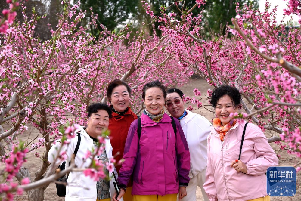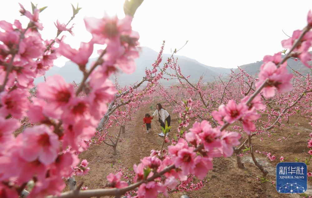 ↑ 4月15日,游客在河北省遵化市党峪镇下马家峪村桃树园赏花游玩。新华社发(刘满仓摄)