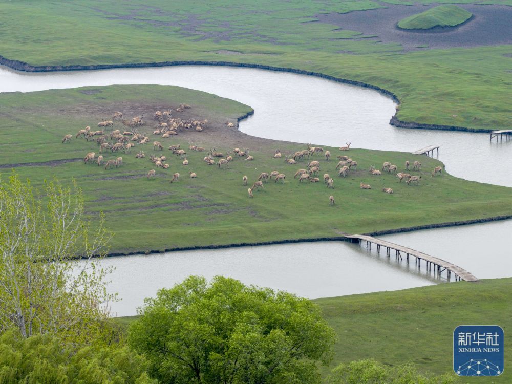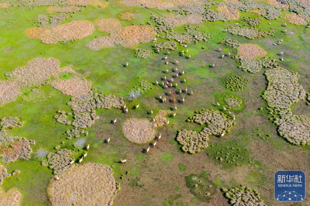 ↑ 4月17日,在江苏省泰州市姜堰区溱湖国家湿地公园,一群麋鹿在栖息、觅食(无人机照片)。新华社发(周社根摄)