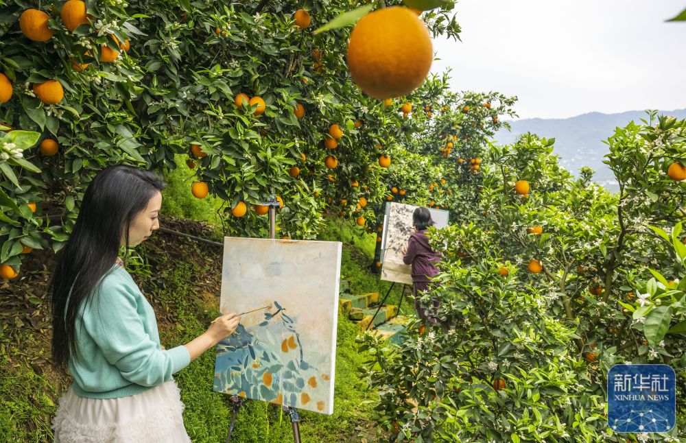 ↑ 4月15日,人们在湖北省秭归县水田坝乡龙口村橘园里写生。新华社发(郑家裕摄)