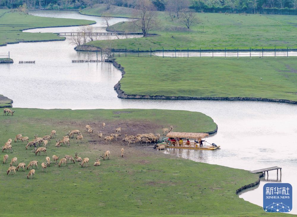 ↑ 4月17日,在江苏省泰州市姜堰区溱湖国家湿地公园,游客乘坐木筏和麋鹿近距离互动(无人机照片)。新华社发(周社根摄)