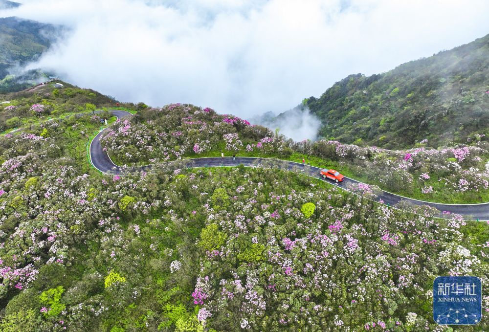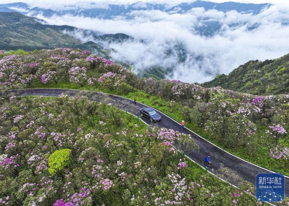 ↑ 4月17日,游客在湖南省永州市双牌县阳明山国家森林公园杜鹃花海赏花游玩(无人机照片)。新华社发(周秀鱼春摄)