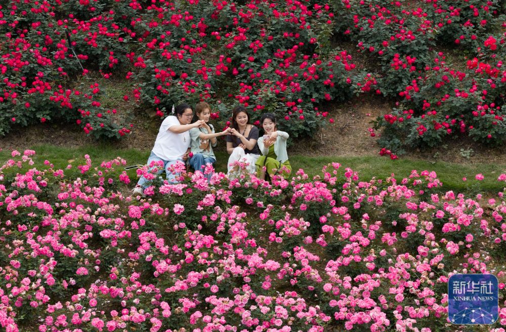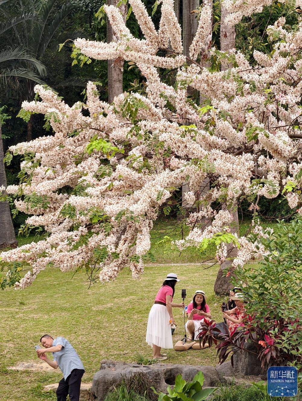 ↑ 4月15日,游人在广西南宁市人民公园赏花拍照。新华社发(喻湘泉摄)